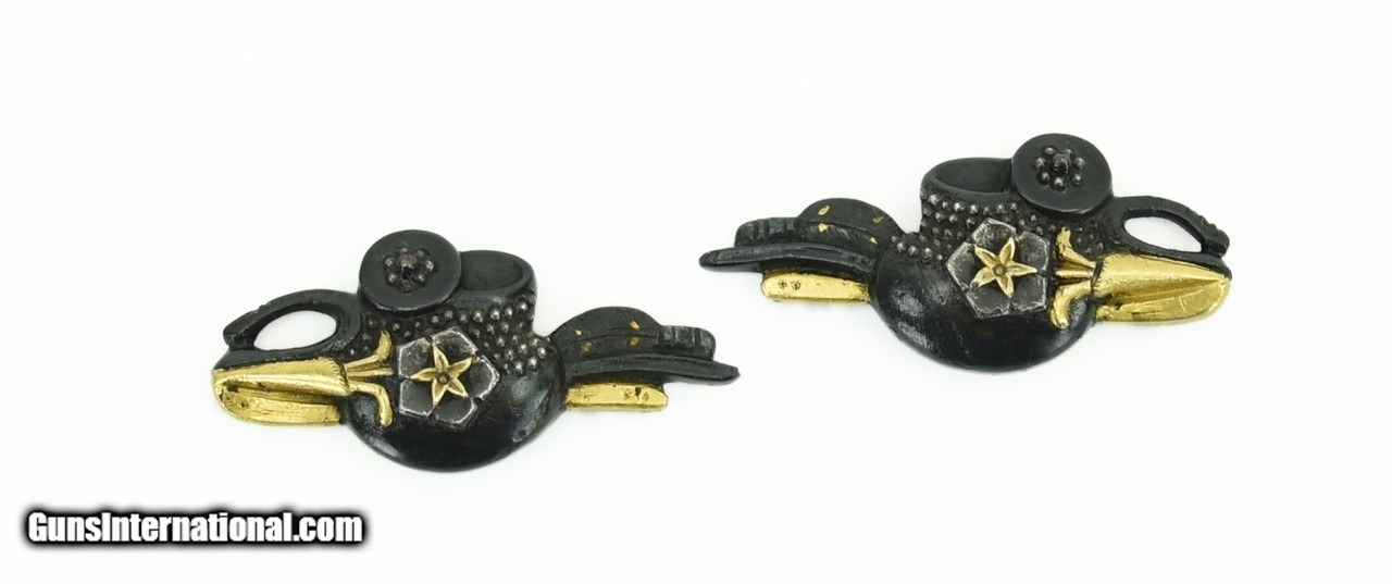Description: "Pair of Menuki. Formed as tea kettles, fans, and flowers arrangements in shakudo, gold, and silver. SOLD |