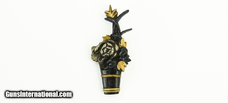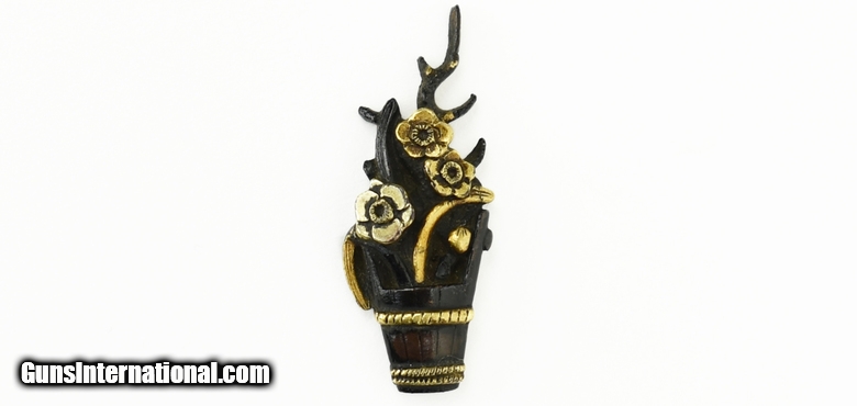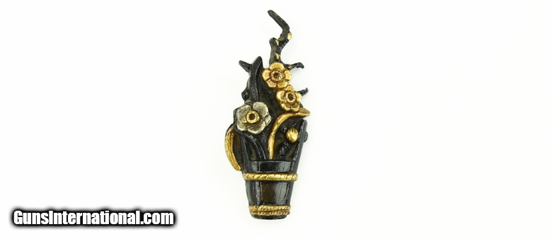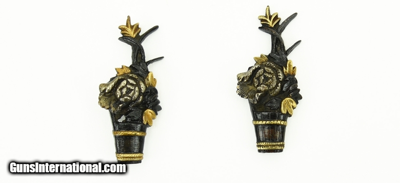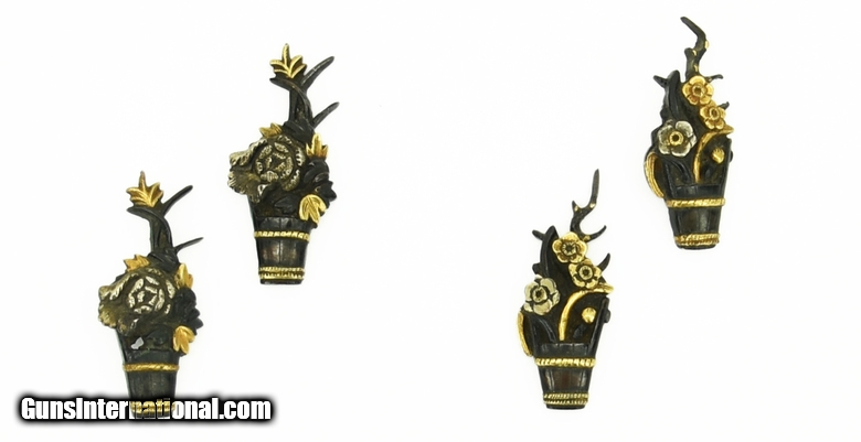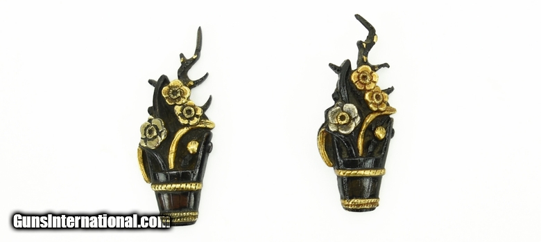 Description: "Two pairs of kinko Menuki. Gold and silver flowers in vases with shakudo ground. Tanto size SOLD |