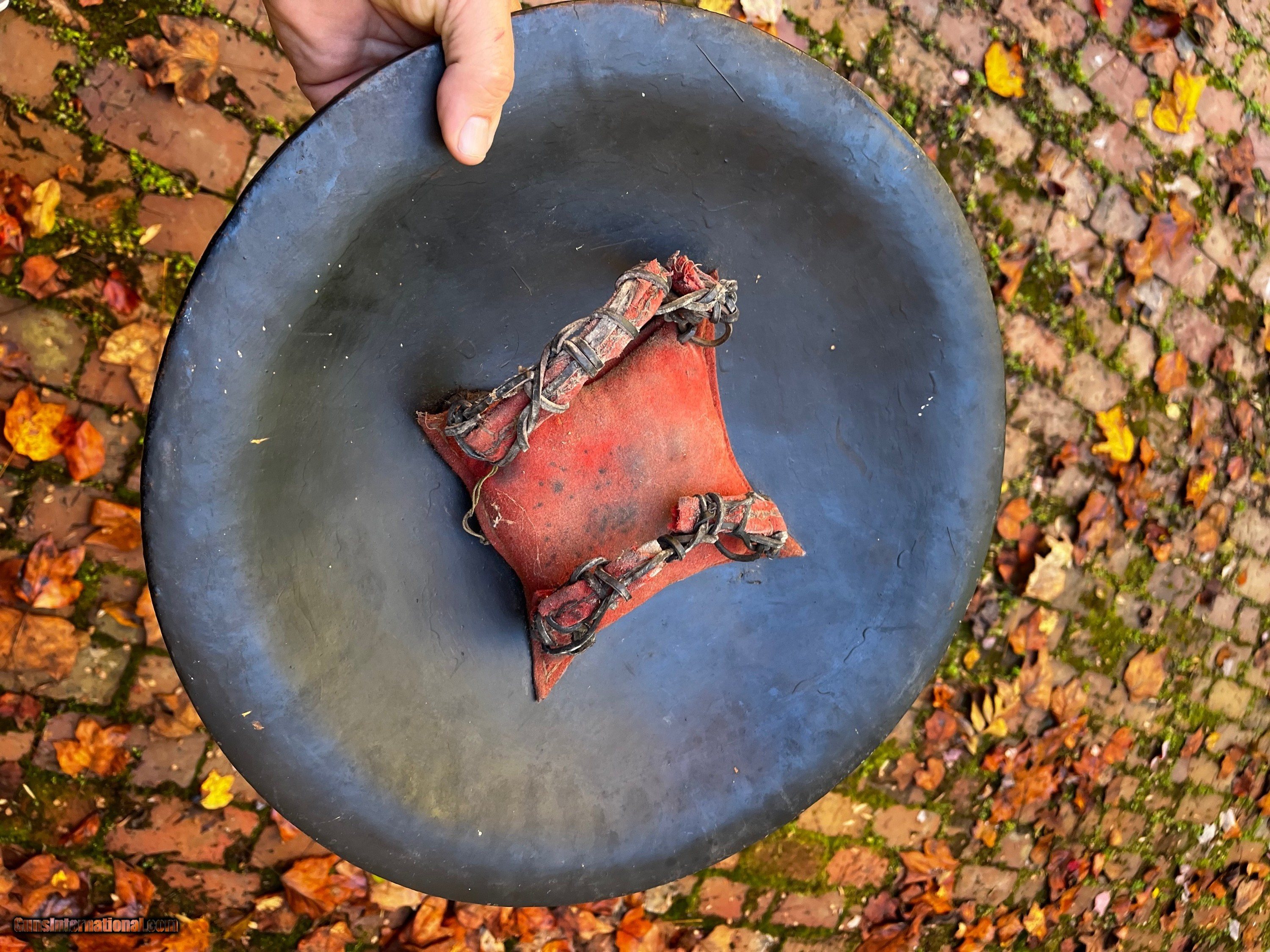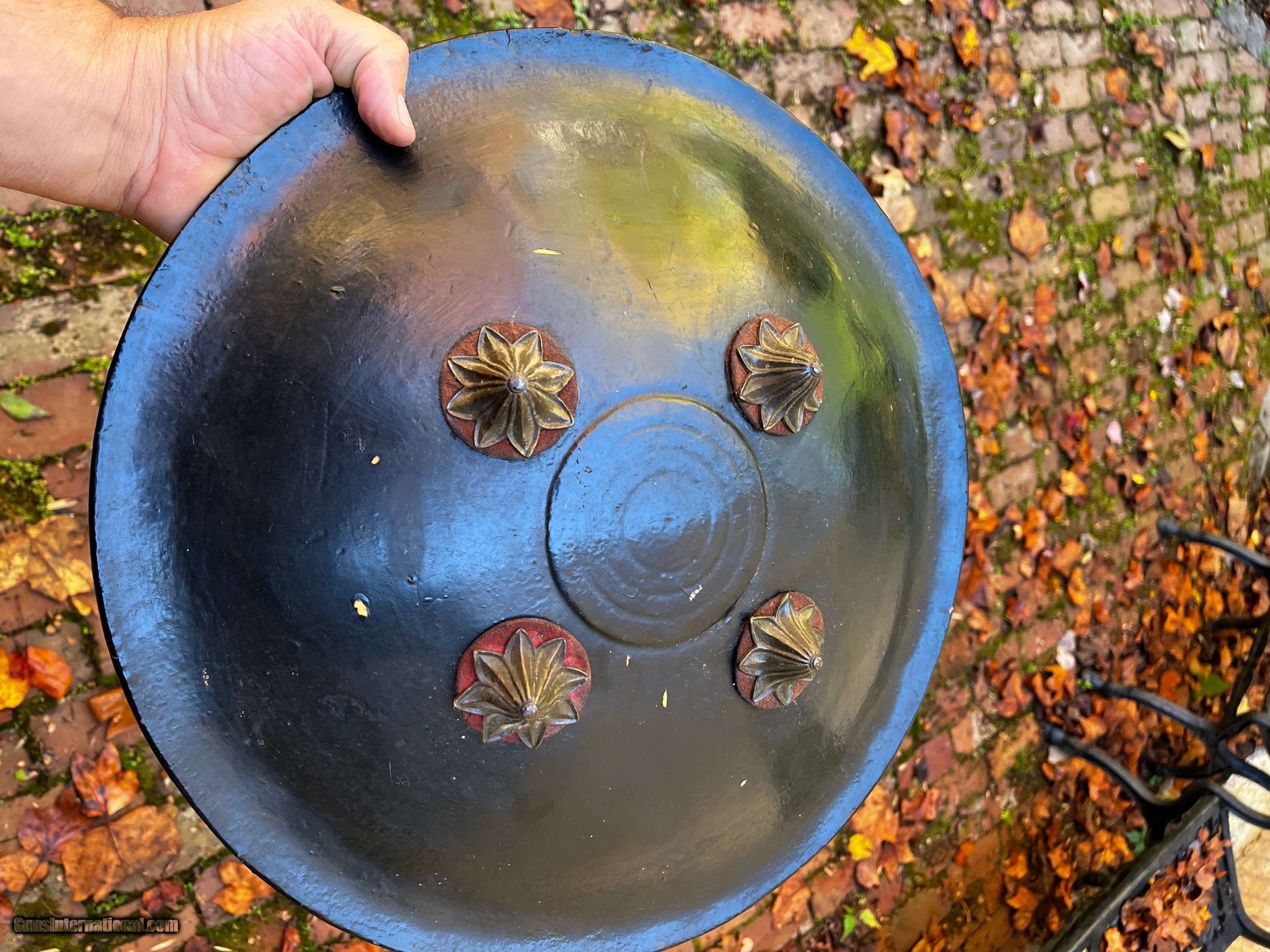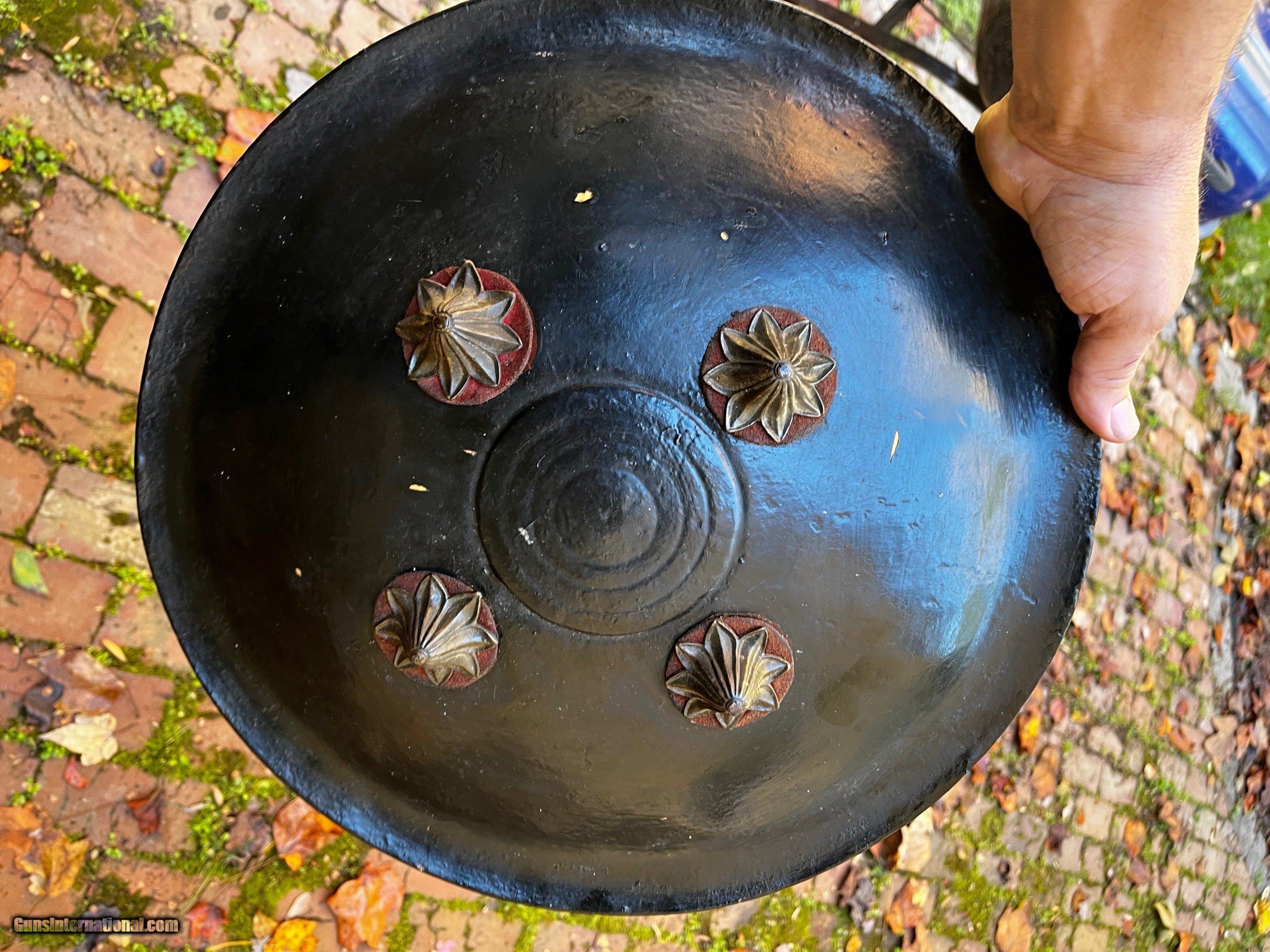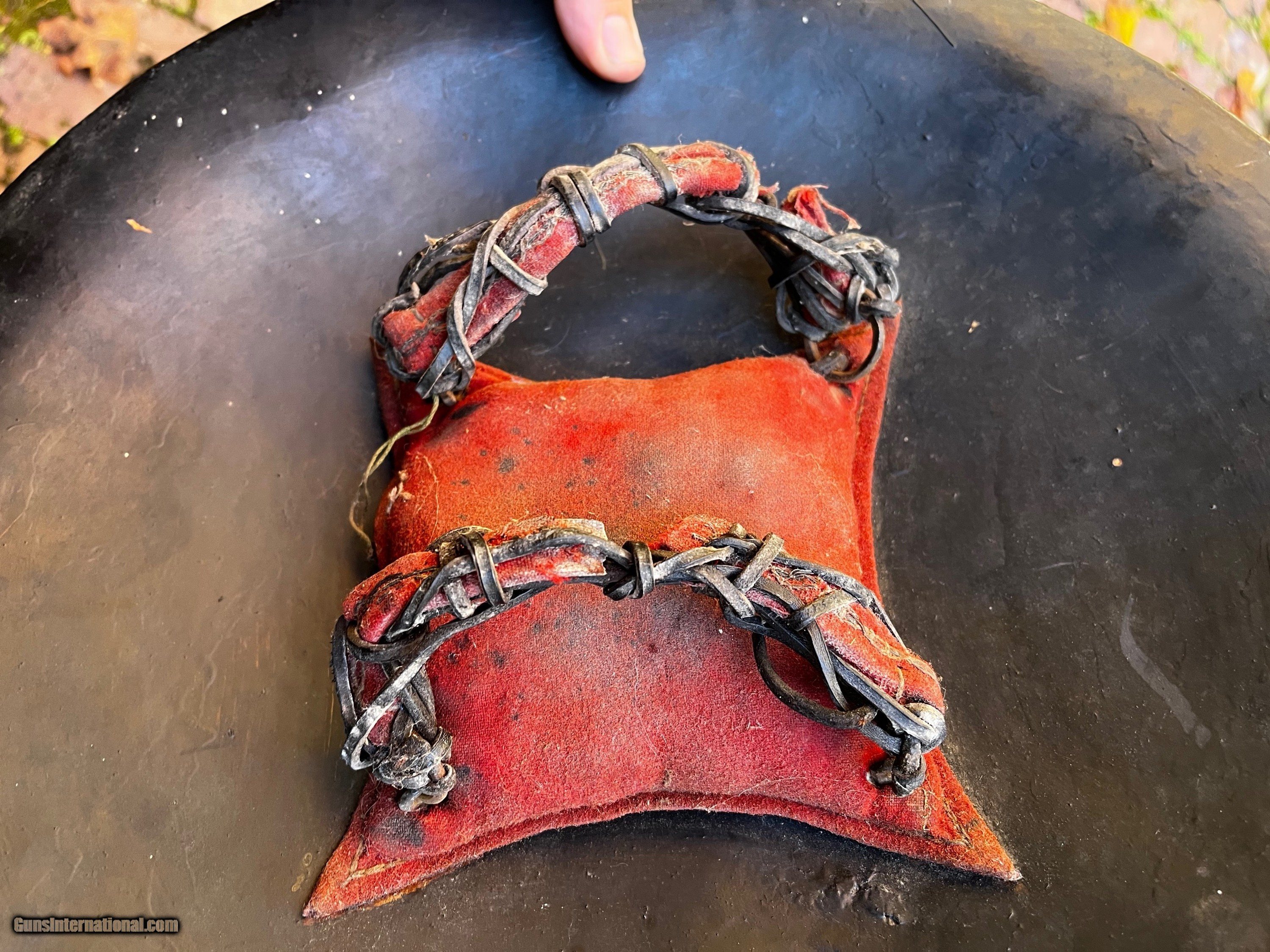 Description: Measures 16 1/2 inches across and made of a hard leather with the embossings and decorative pieces on outside ,, handle has been wrapped with later replacement leather lace SOLD |