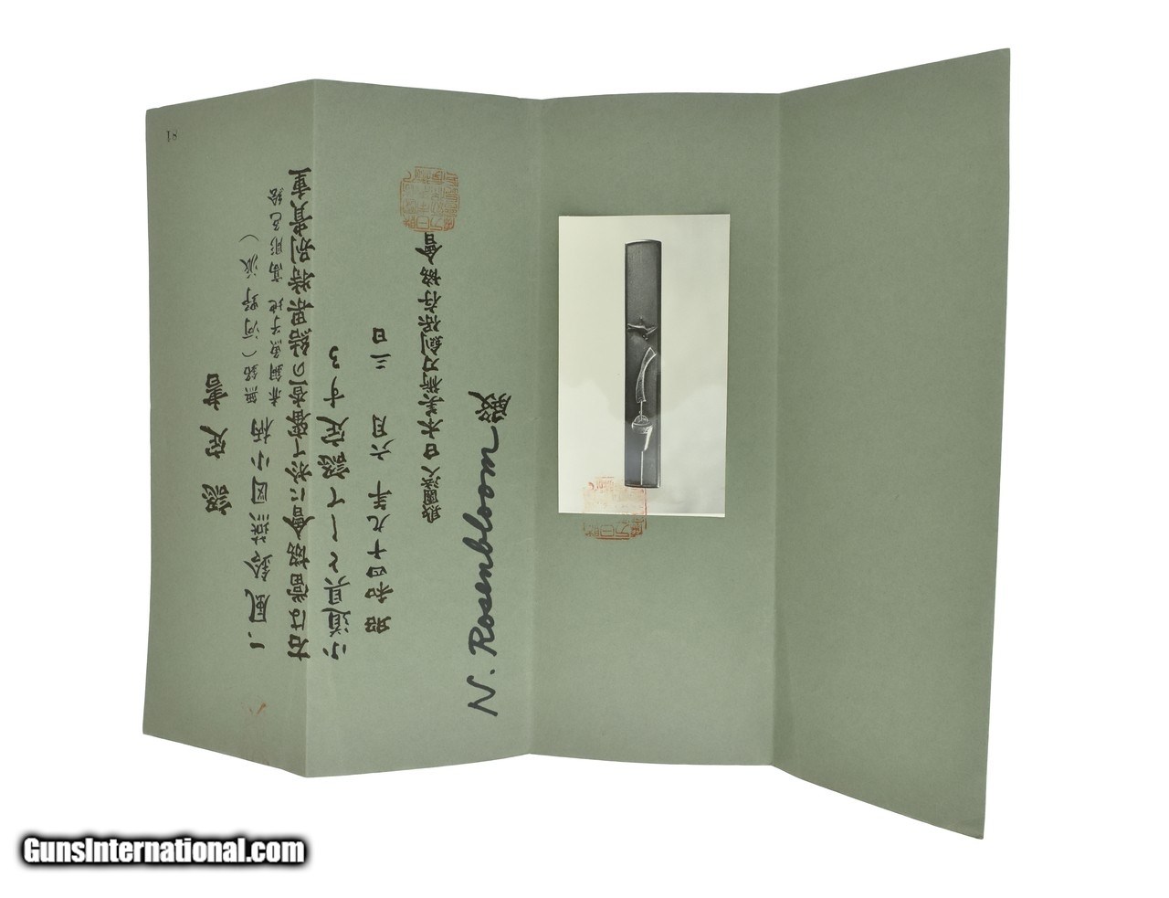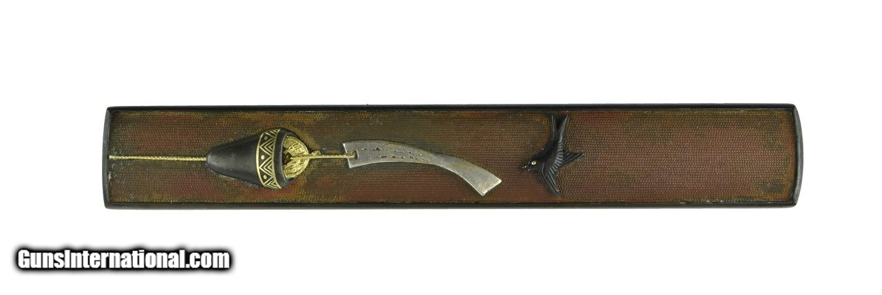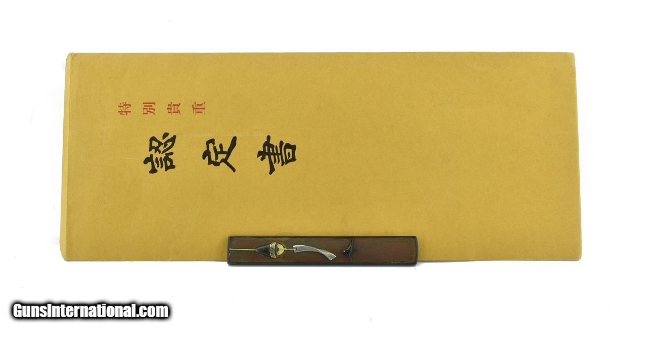 Description: "Copper Nanako Ground. Reverse is polished shakudo prayer bell with gold highlights. Silver paper prayer suspended from bell. Included is N.B.T.H.K. certificate from 1974. Unsigned. SOLD |