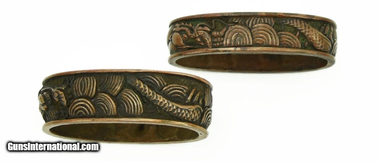 Description: "Dai- Sho Fuchi Kashira Motif is Dragon in Waves. Copper colored. One Fuchi signed: Goto Mitsu Sada. Very good condition. SOLD |