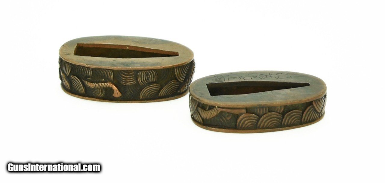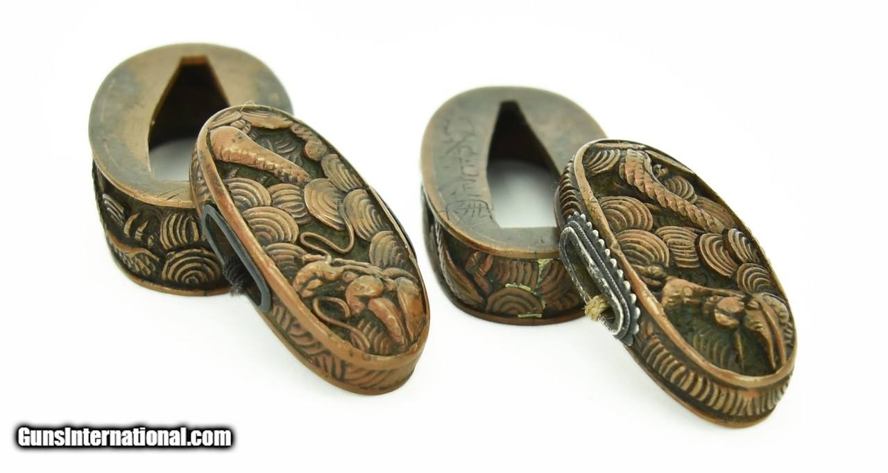 Description: "Dai- Sho Fuchi Kashira Motif is Dragon in Waves. Copper colored. One Fuchi signed: Goto Mitsu Sada. Very good condition. SOLD |