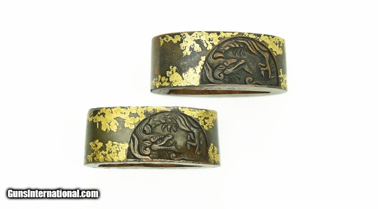 Description: "Dai-Sho Fuchi Kashira Kinko (soft metal) of swirling dragoons with gold highlights. Both Fuchi signed. Very good condition. SOLD |