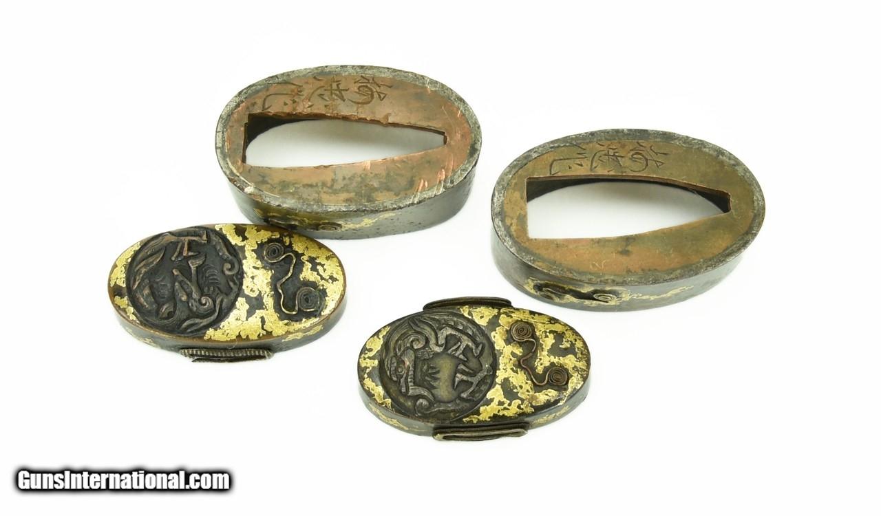 Description: "Dai-Sho Fuchi Kashira Kinko (soft metal) of swirling dragoons with gold highlights. Both Fuchi signed. Very good condition. SOLD |