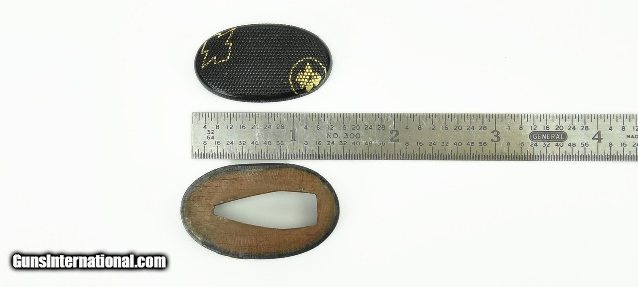 Description: "Kinko Fuchi Kashira. Shakudo Nanako Ground with unusual stylized Diamond Mon Rattern overland in gold. Solid gold Mon on Fuchi. Mumei (unsigned) SOLD |