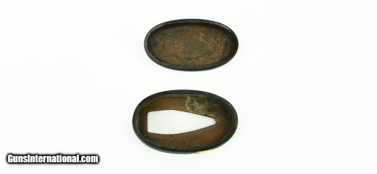 Description: "Kinko Fuchi Kashira. Shakudo Nanako Ground with unusual stylized Diamond Mon Rattern overland in gold. Solid gold Mon on Fuchi. Mumei (unsigned) SOLD |