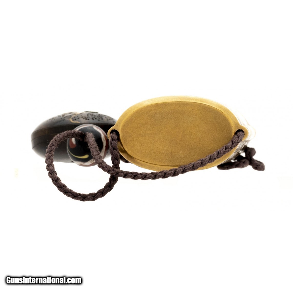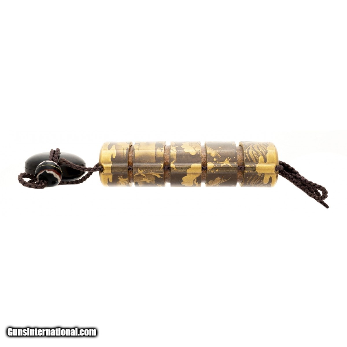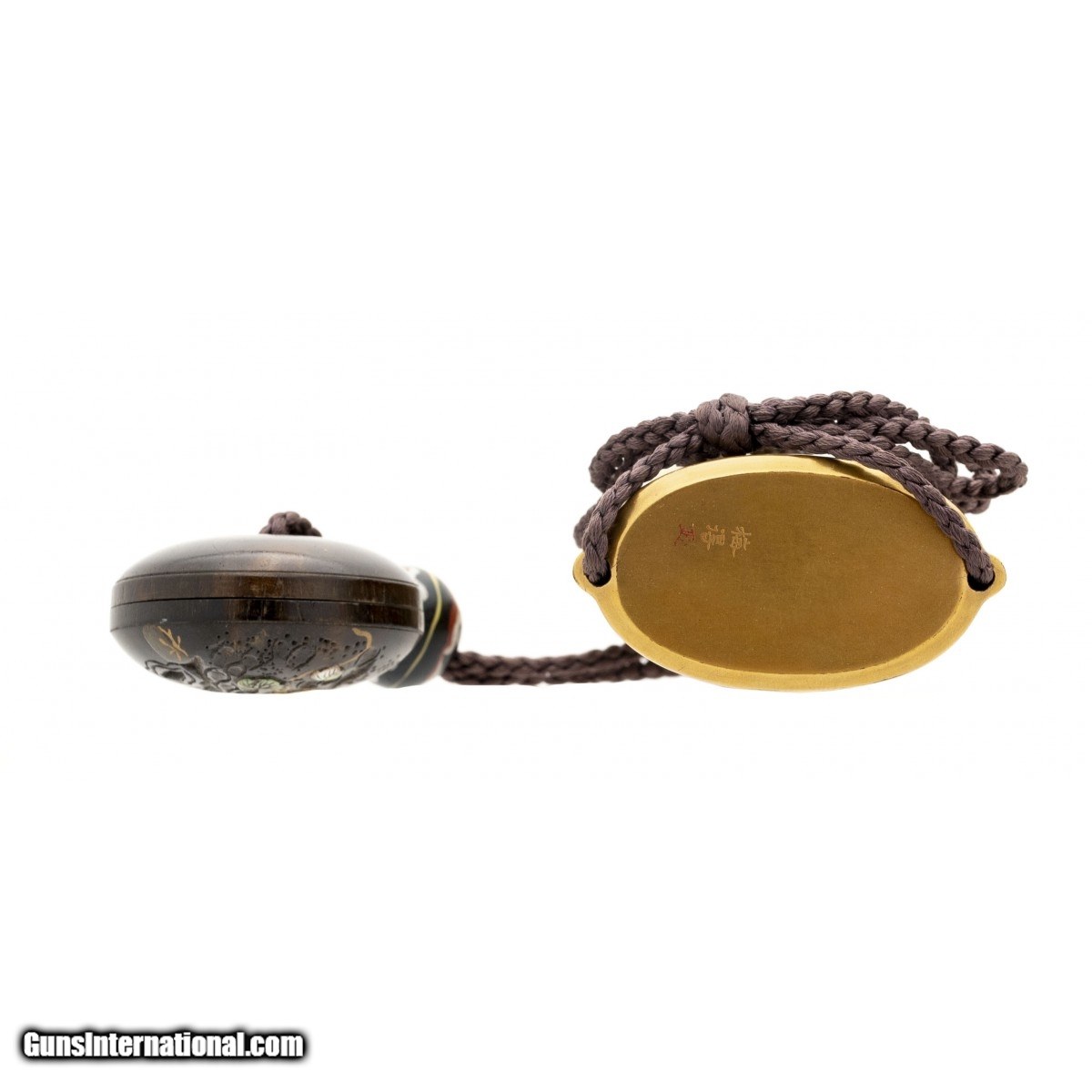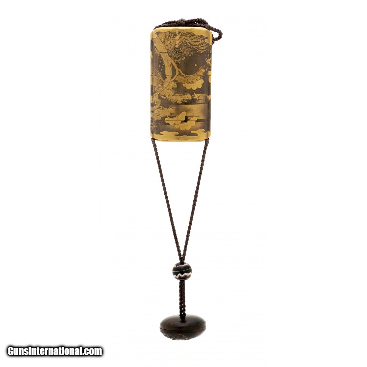Has Bonsai trees with frothing waves in background with storks. Ojime is multi-colored ball with red, white, and wavy motif Monju Ojime.