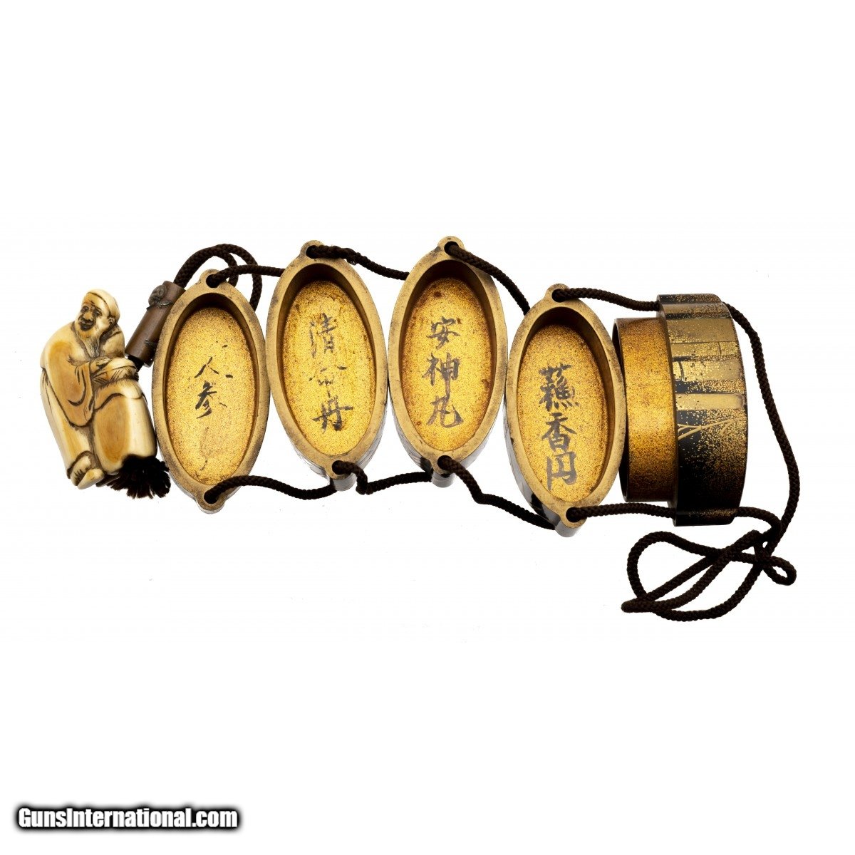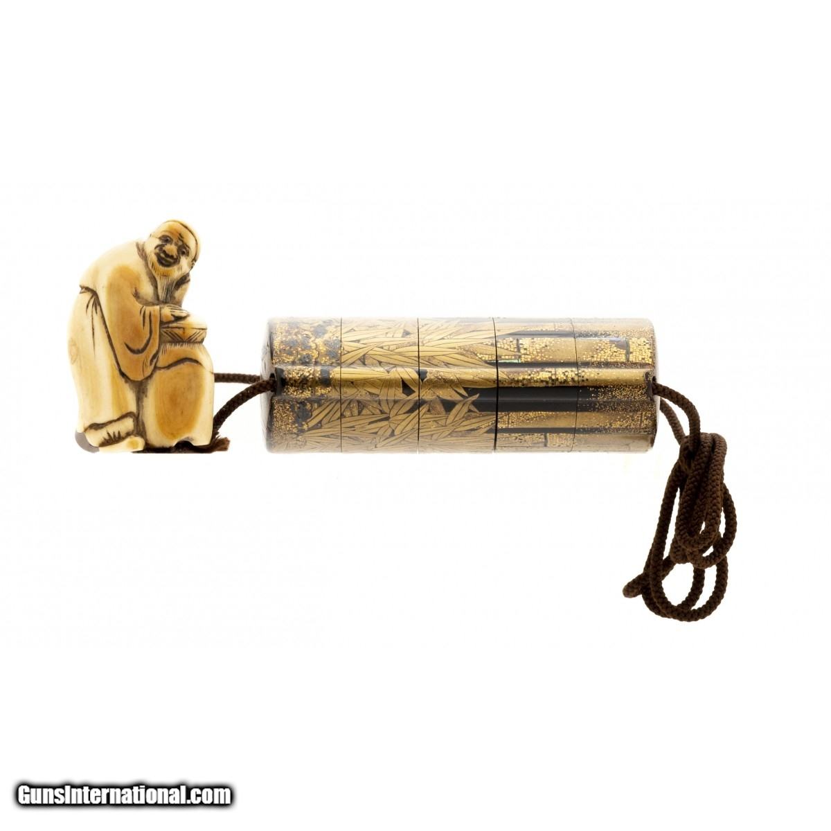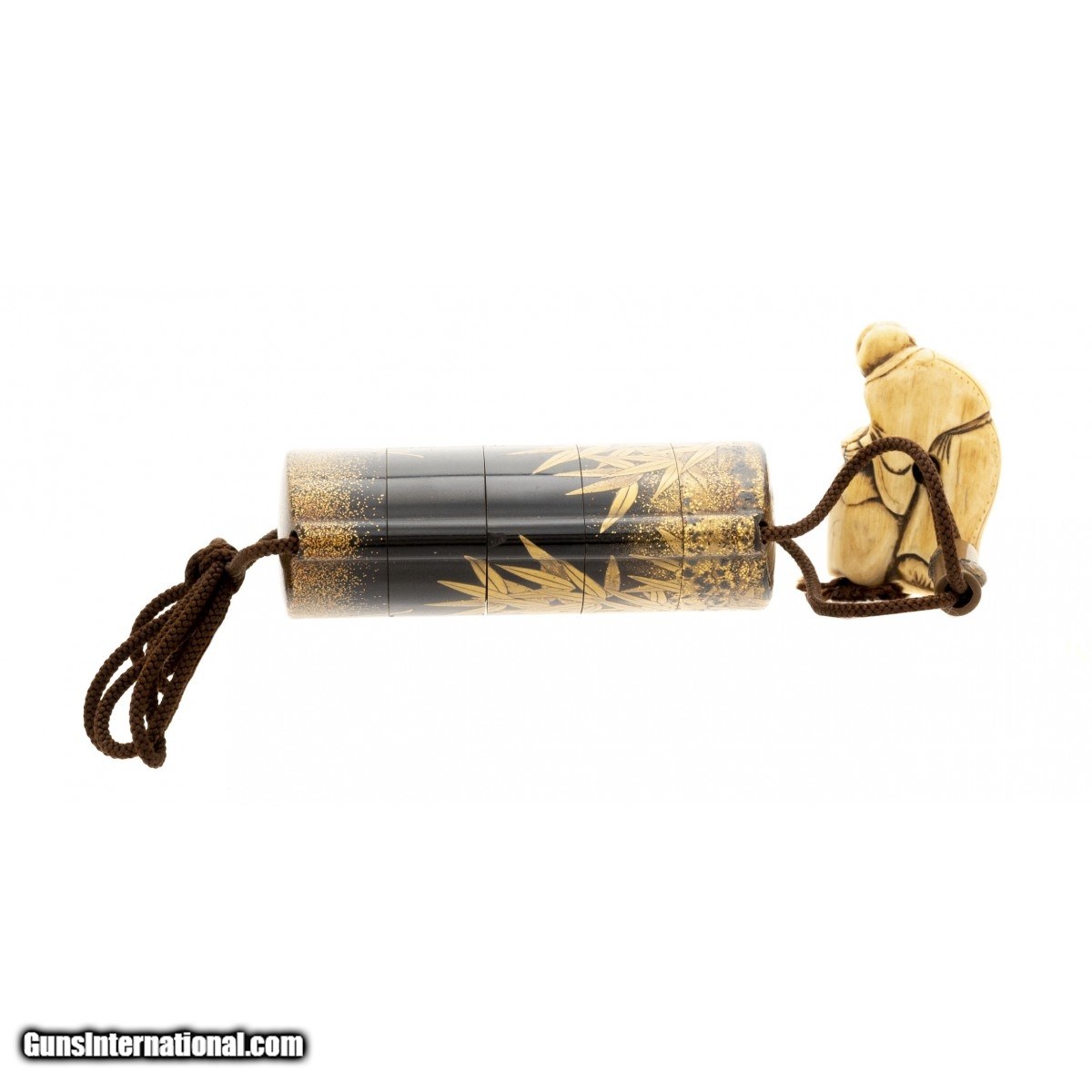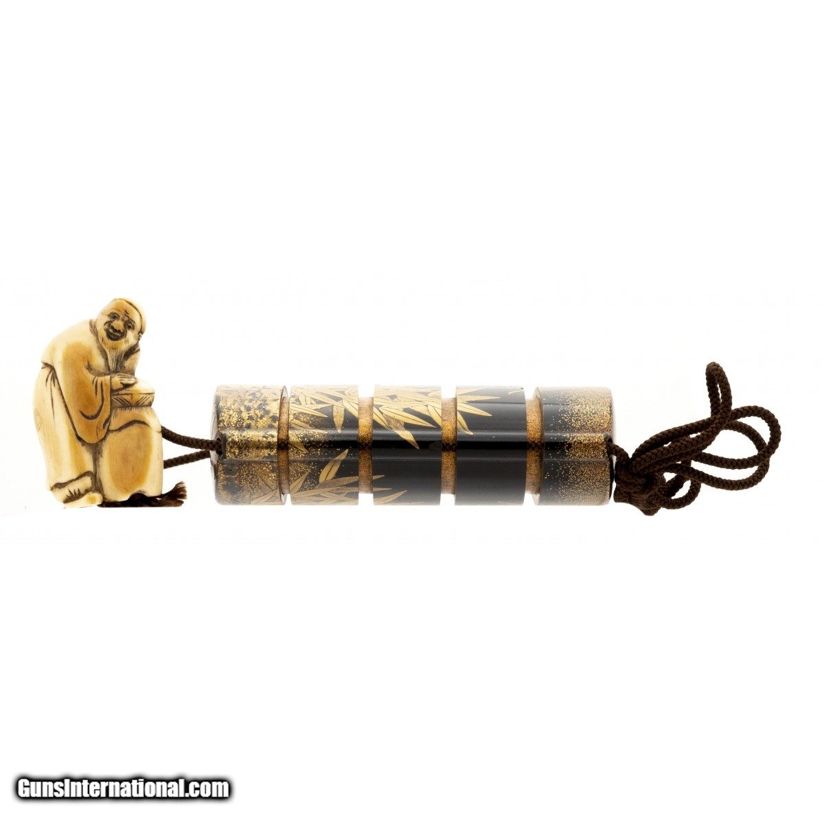 Description: " Has palm fronds and bamboo some abrasion on top section. Netsuke has ivory priestly figure. SOLD |