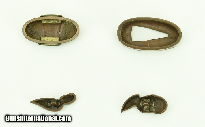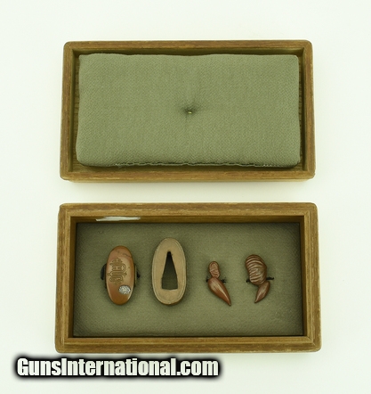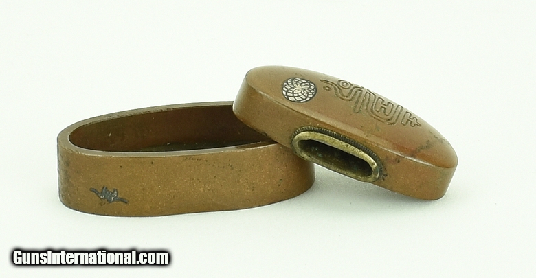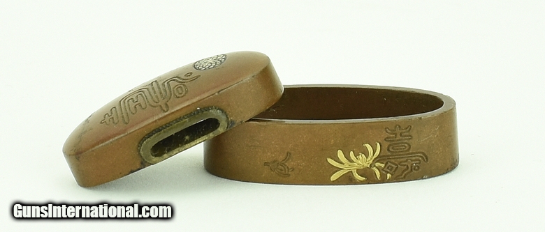 Description: "Fuchi Kashira and Menuki. Polished copper with gold and shibuichi highlights. Custom box. Unsigned. SOLD |