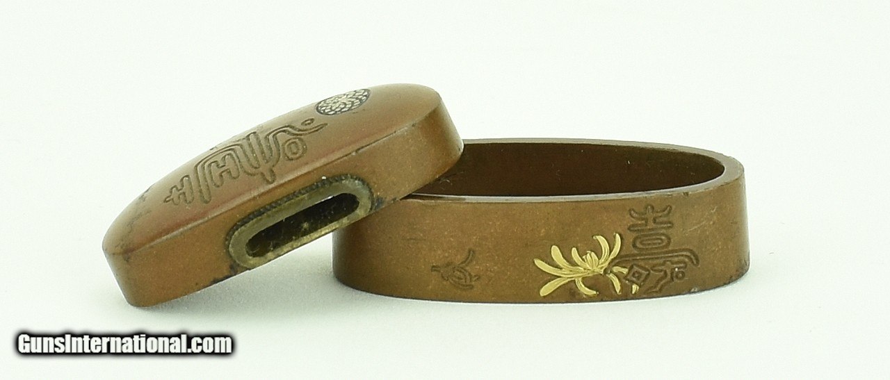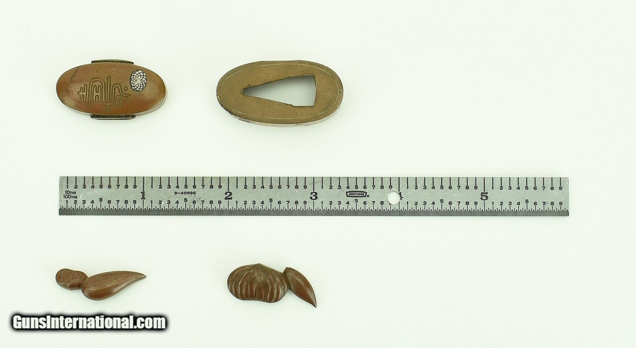 Description: "Fuchi Kashira and Menuki. Polished copper with gold and shibuichi highlights. Custom box. Unsigned. SOLD |