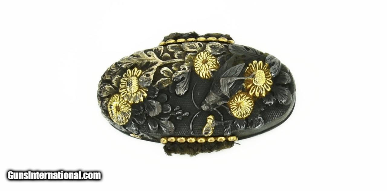 Description: "Fuchi Kashira Foliage with Insects: gold and silver highlights fine shakudo Nanako. Excellent condition. SOLD |