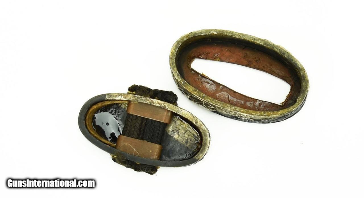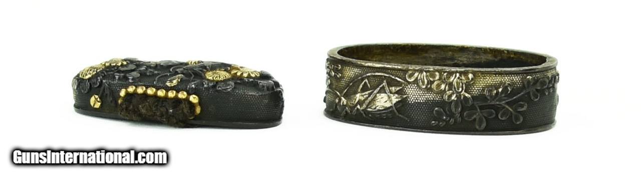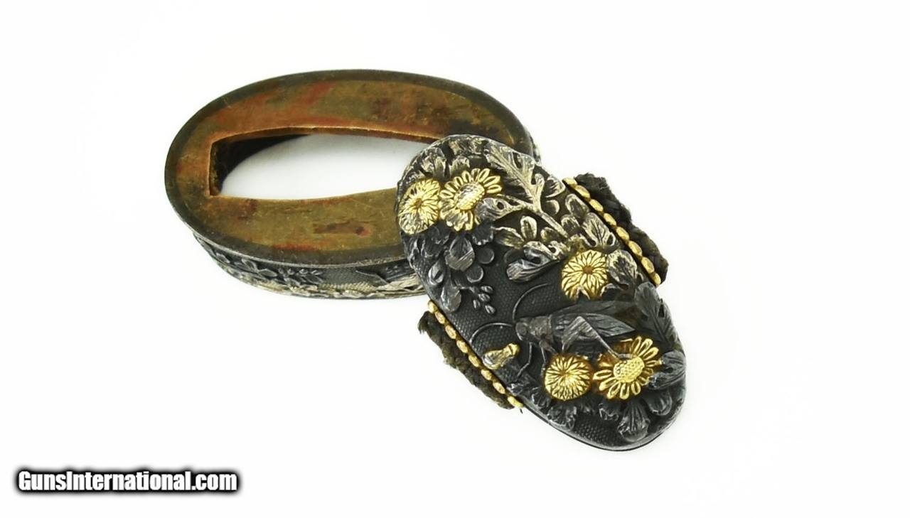 Description: "Fuchi Kashira Foliage with Insects: gold and silver highlights fine shakudo Nanako. Excellent condition. SOLD |