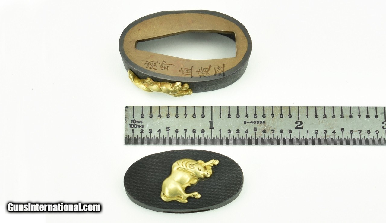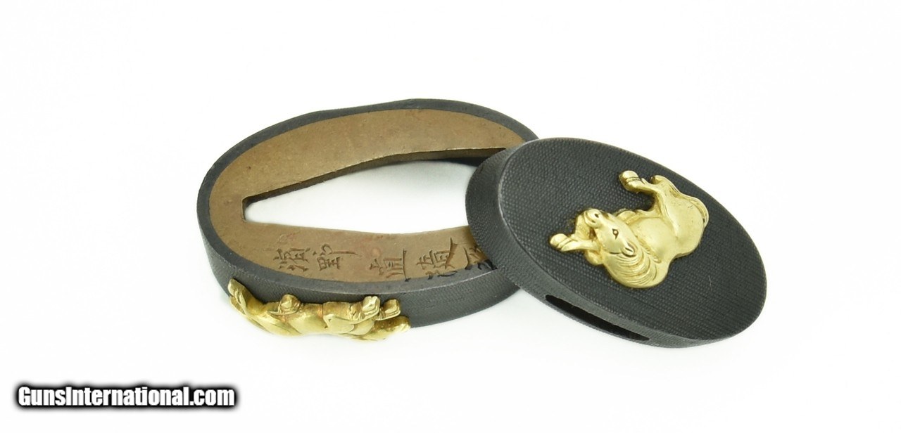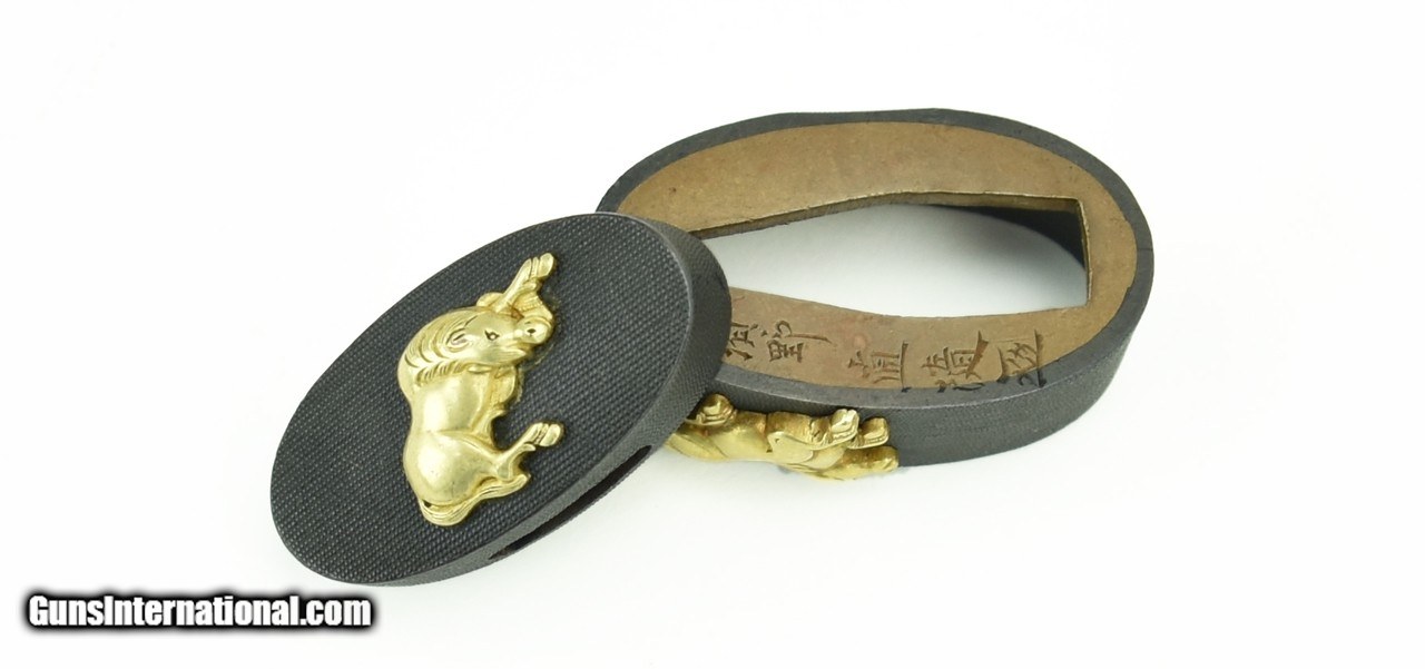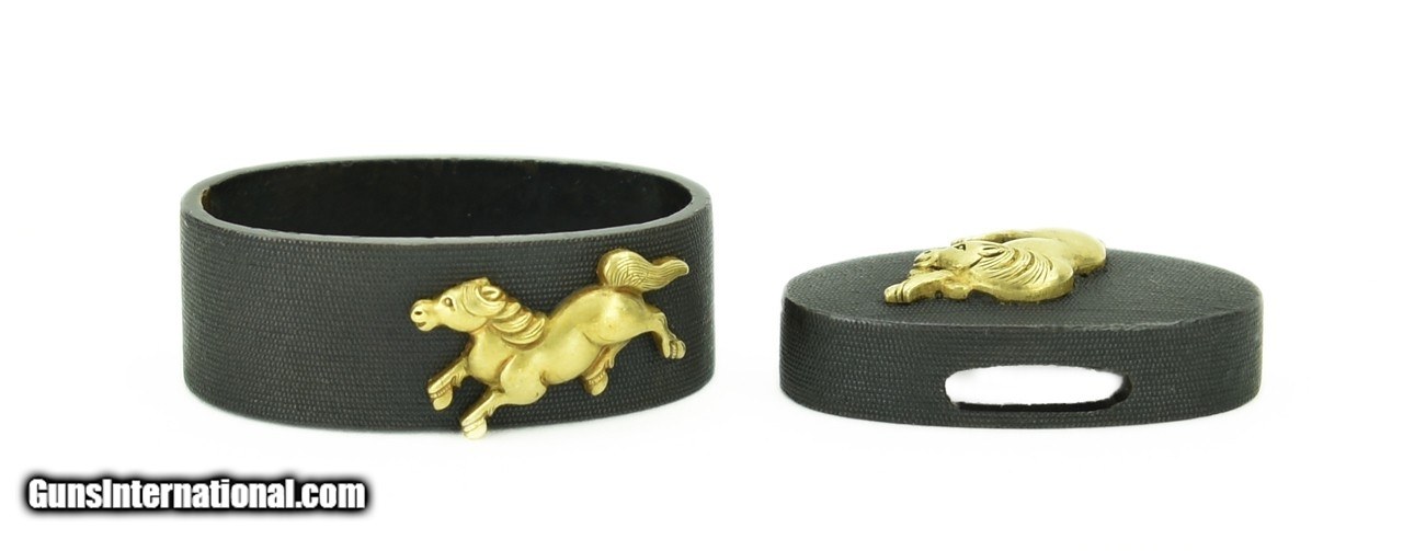 Description: "Fuchi Kashira. Gold horses on shukudo nanako. Signed: hamano naotuki with kao. Excellent condition. SOLD |
