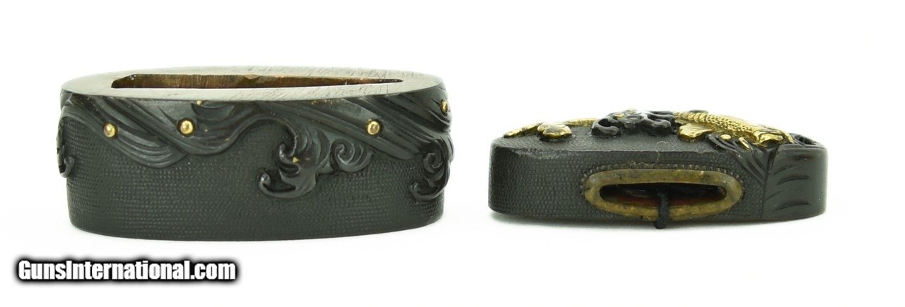 Description: "Fuchi Kashira gold Koi swimming in gold flecked waves. Unsigned. Shakudo Nanako ground. Excellent condition. SOLD |
