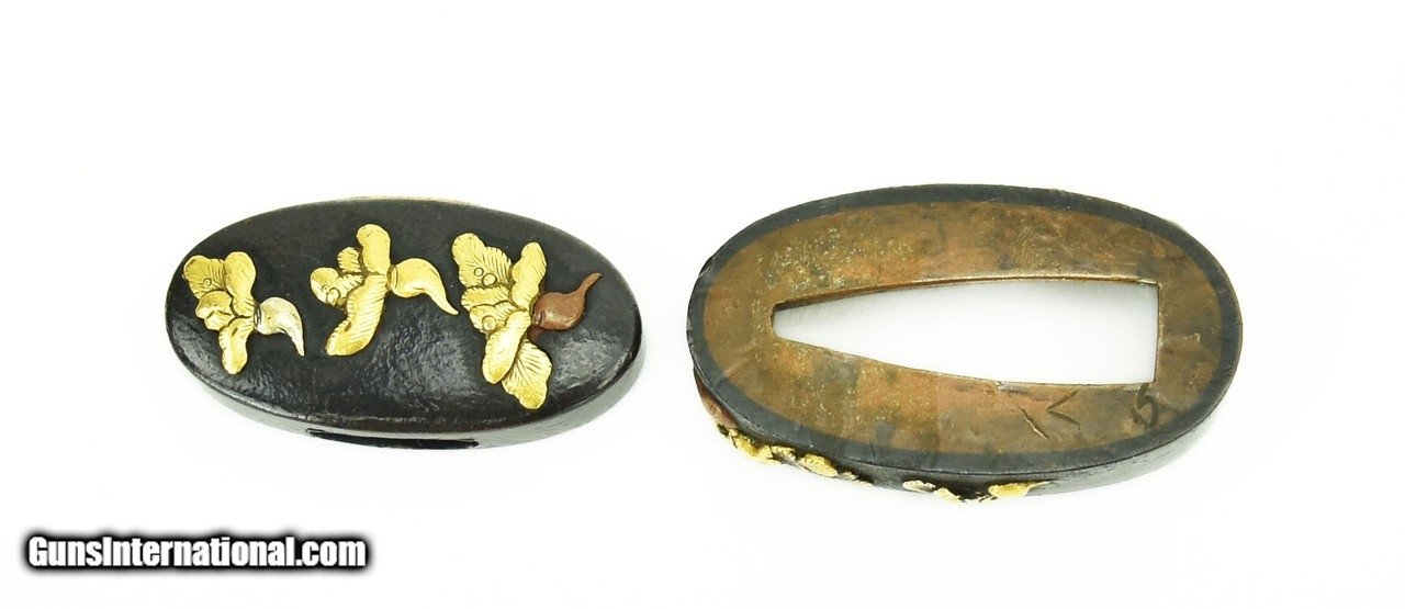 Description: "Fuchi Kashira Shakudo Ishime finish. Flower Motif with gold and copper highlights. Excellent conditions. SOLD |