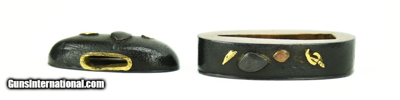 Description: "Fuchi Kashira Shakudo Ishime Seashell Motif in gold and copper. Very good condition. SOLD |