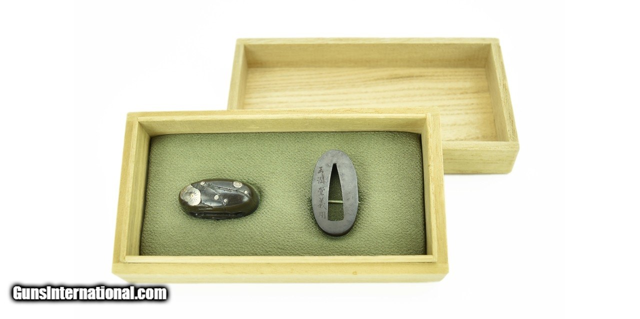 Description: "Fuchi Kashira silver blossoms. Dark brown patina signed: Yoshi Aki. 3rd quarter of 19th century. Worked in Edo. SOLD |