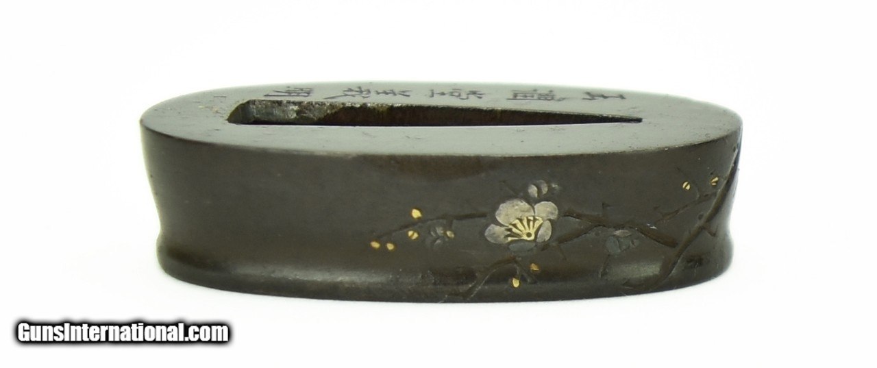 Description: "Fuchi Kashira silver blossoms. Dark brown patina signed: Yoshi Aki. 3rd quarter of 19th century. Worked in Edo. SOLD |