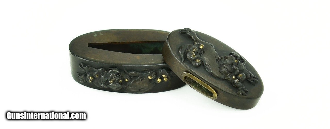 Description: "Fuchi Kashira well cut Shishi in Shakudo. Gold Highlights. Unsigned. Excellent condition. SOLD |