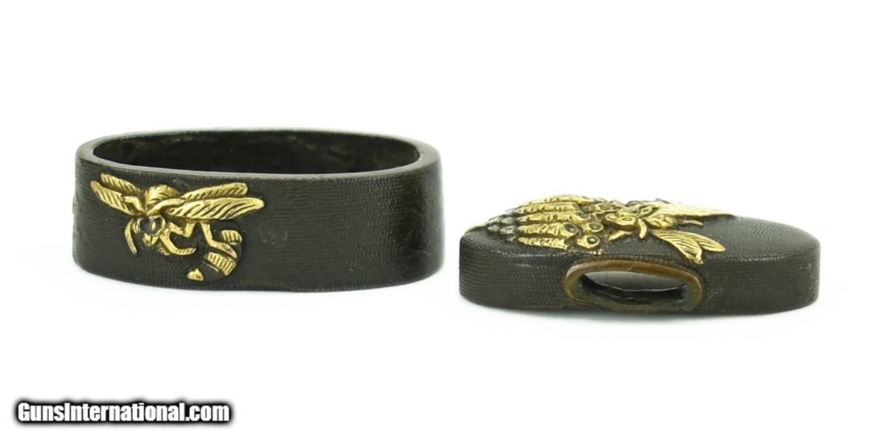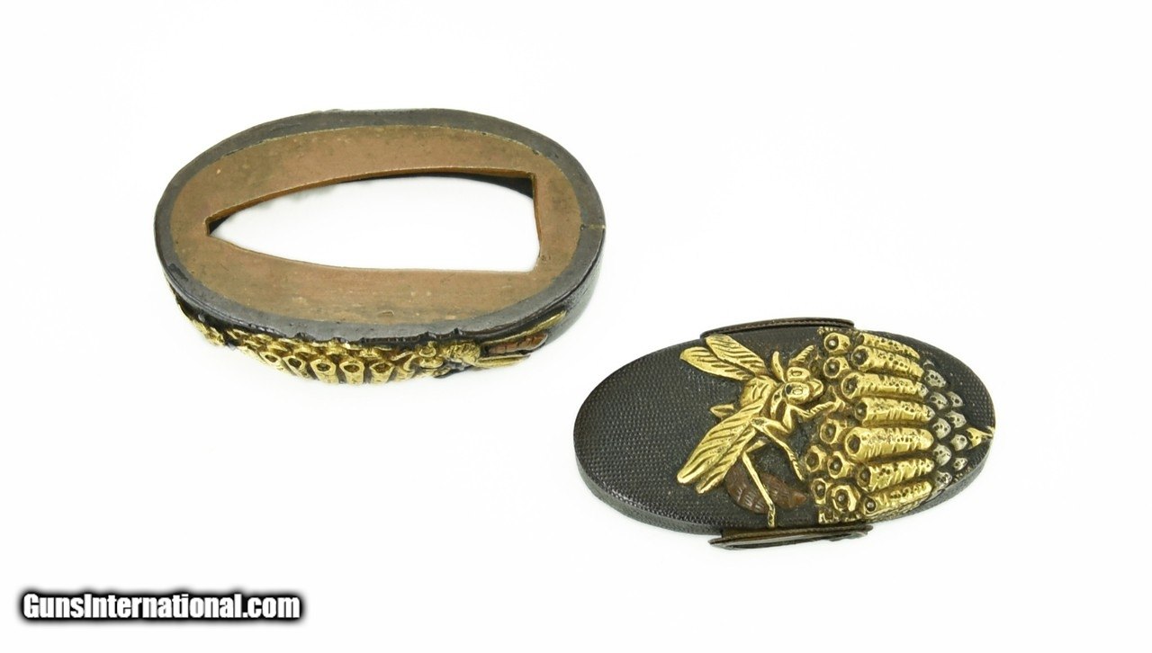 Description: "Fuchi Kashira with wasps tending their nest. Body of wasp is copper as well as legs. Gold wings with nest being gold and silver. Shakudo Nanako, ground. Unusual subject. SOLD |