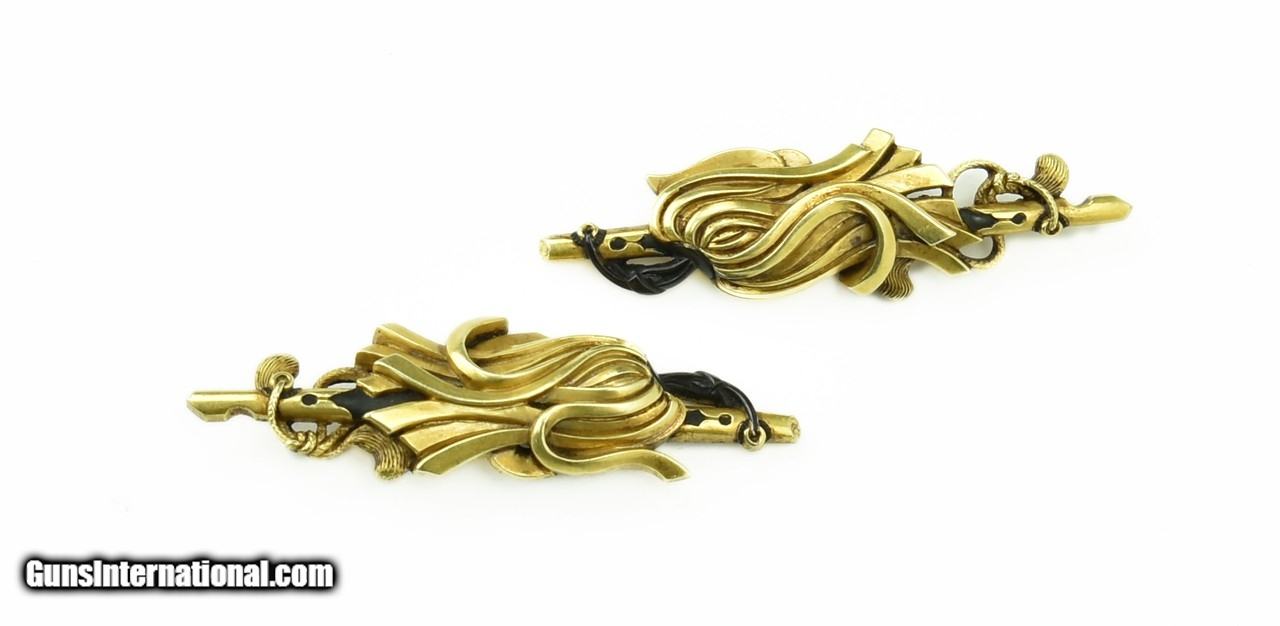 Description: "Menuki. Gold and Shakudo signal fans signed: Kikuoka Mitsu Masa 1759-1824. Pupil of Yanagawa Nao Mitsu. Became leader of Kikvoka School. Excellent condition. SOLD |
