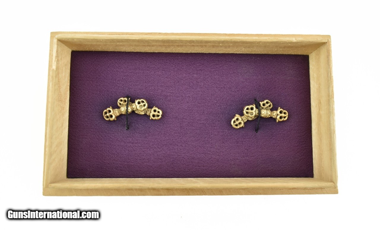 Description: "Gold Menuki. Subject is a type of Vajra often seen with Buddhist Diety of Aizen-Myoo holding this object. SOLD |