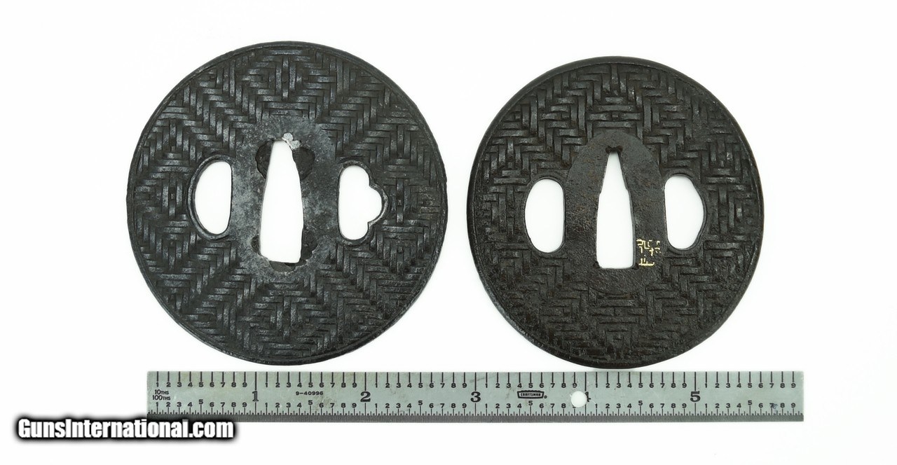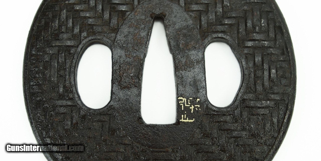 Description: "Iron Dai-Sho Tsuba. Basket weave pattern. Maru Gata shape (round). Remnant of gold kao on Sho. Dai is 2 15/16" (7.5cm); Sho is 2 ¾" (7.1cm). SOLD |