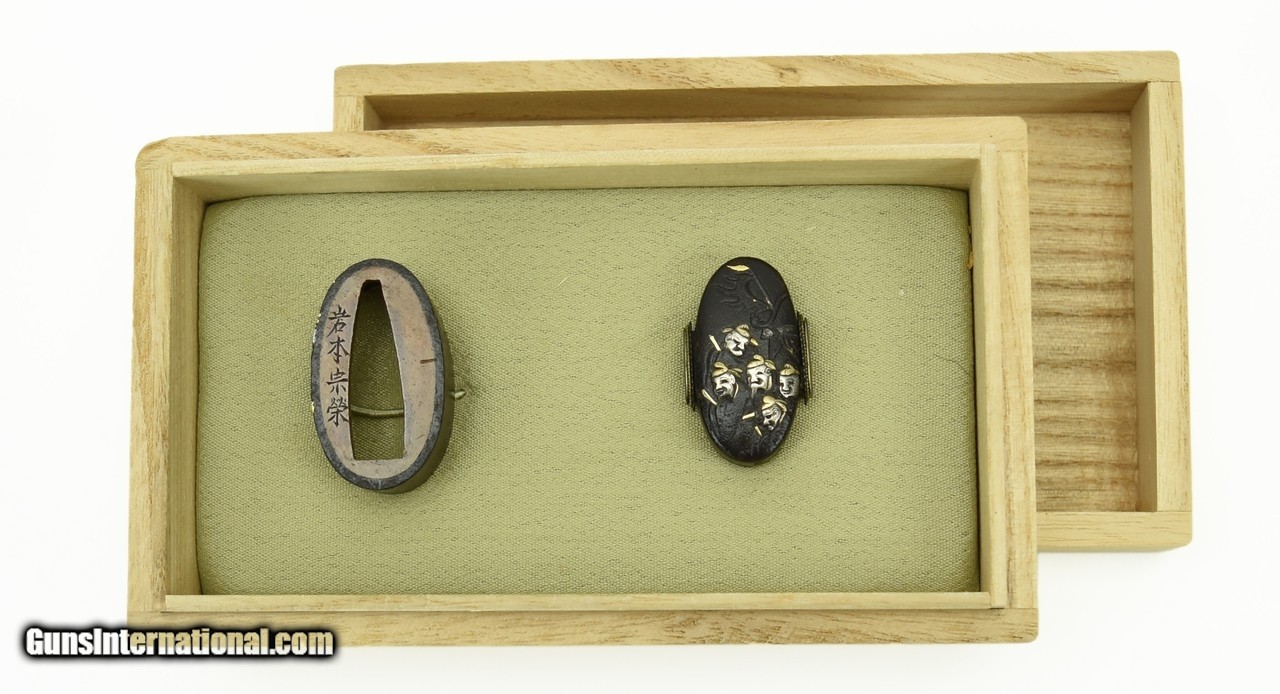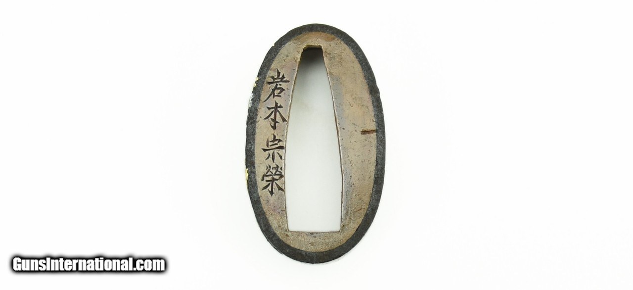 Description: "Iron Fuchi Kashira. Sages with silver and gold highlights on Kashira; reclining sleeping figure on Fuchi. Signed: Iwamoto Mune Yoshi (Soyei), pupil of Iwamoto So-Itsu (last quarter 18th Century, circa 1780). SOLD |