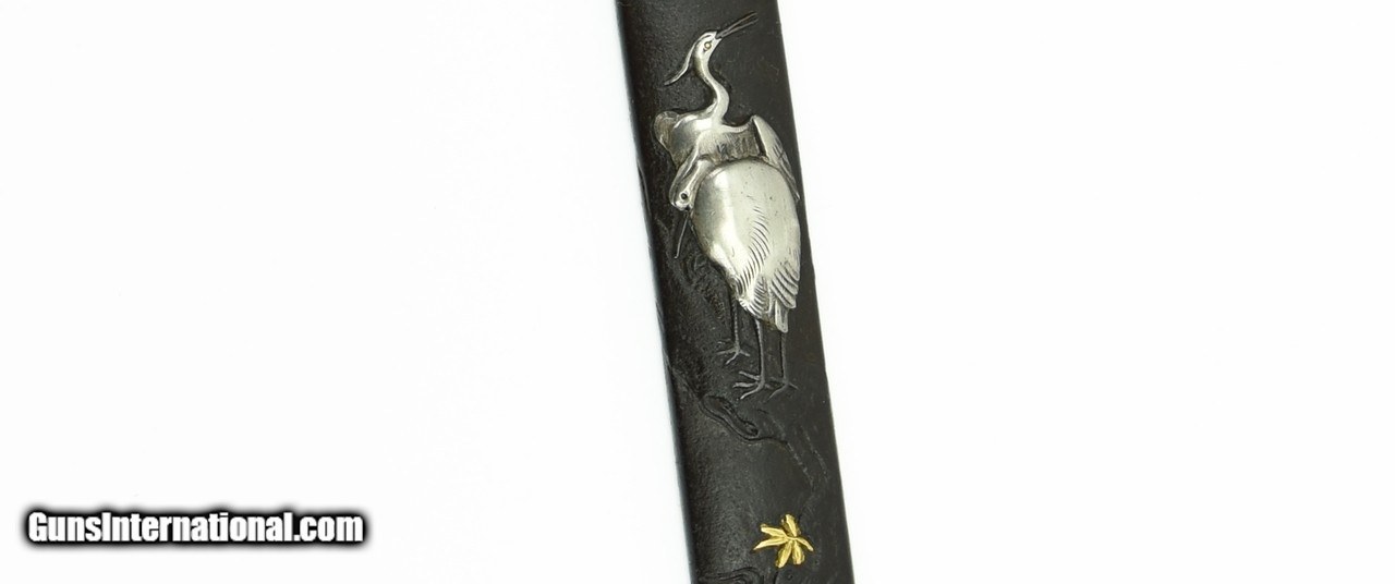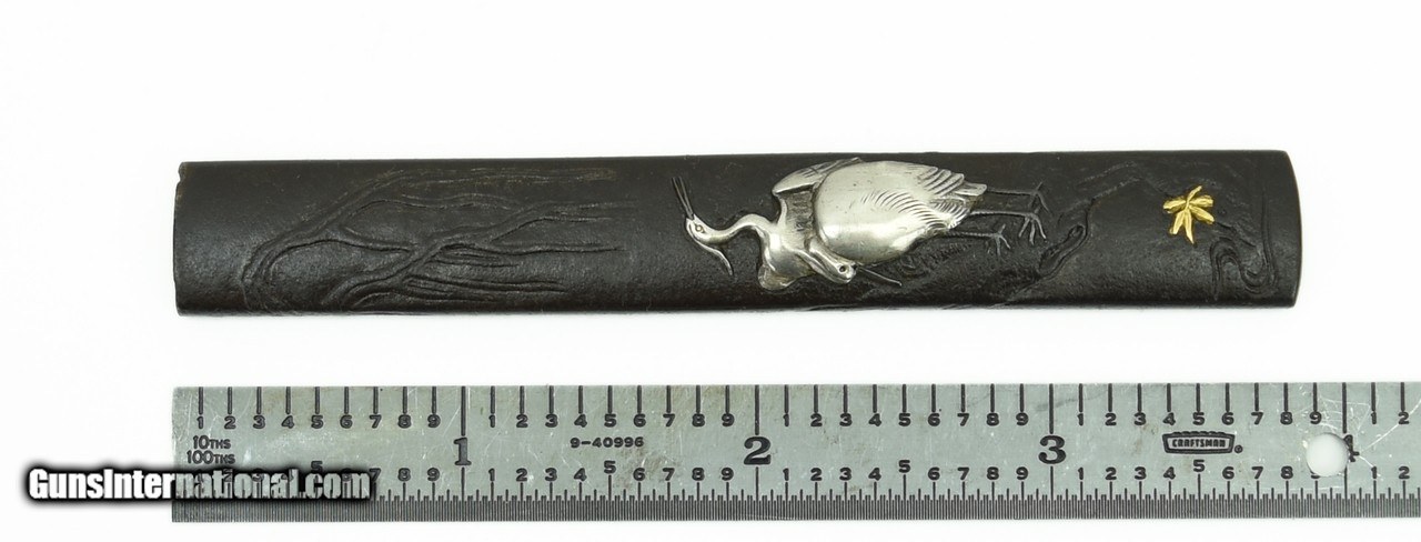 Description: "Iron Kodzuka. Two silver cranes standing on rocky outcrop under a weeping willow gold foliage at base. Signed. SOLD |