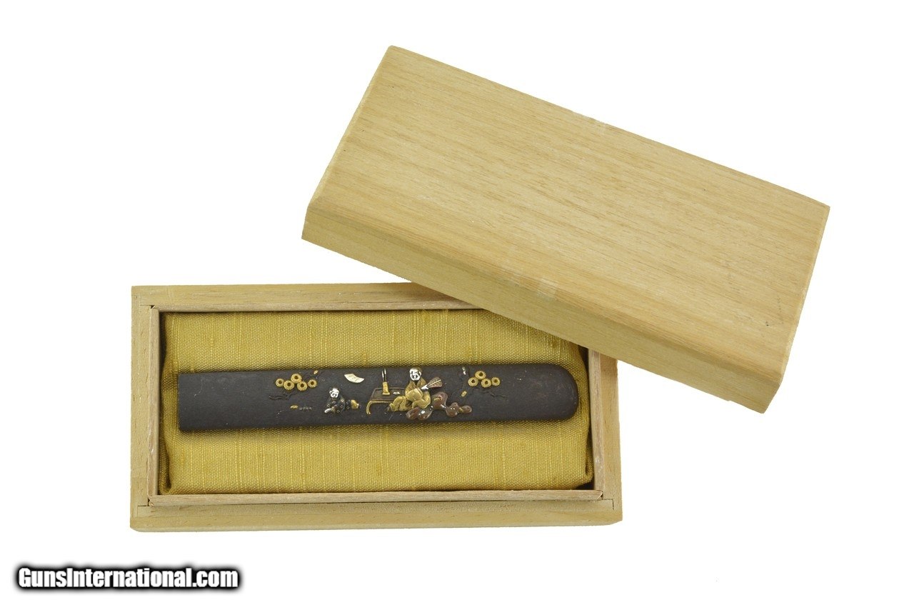 Description: "Iron Kodzuka. Robed figure with fan at writing desk with child on ground. Outdoor scene with wind blowing a silver shakudo and copper. SOLD |