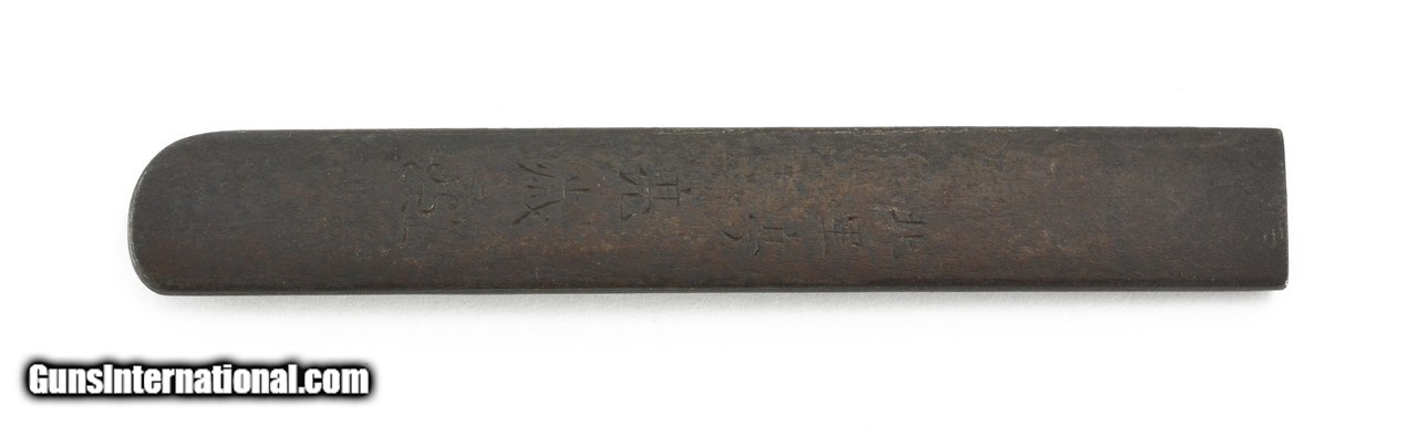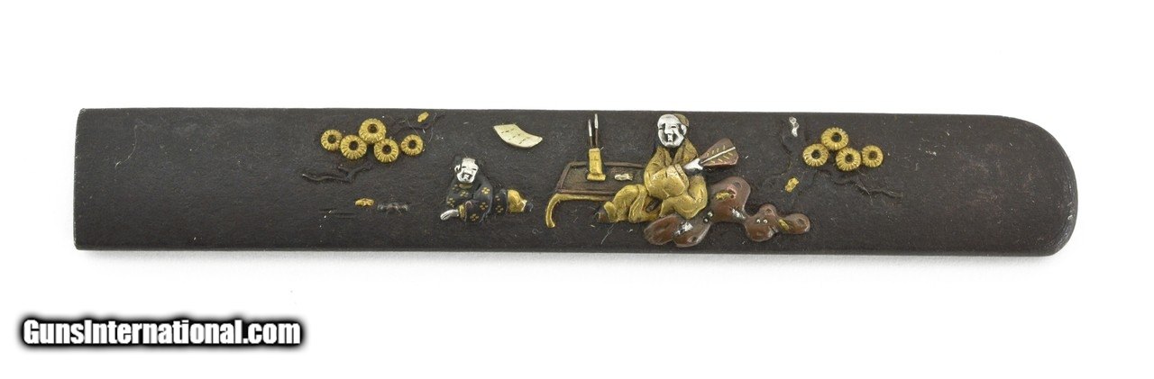 Description: "Iron Kodzuka. Robed figure with fan at writing desk with child on ground. Outdoor scene with wind blowing a silver shakudo and copper. SOLD |