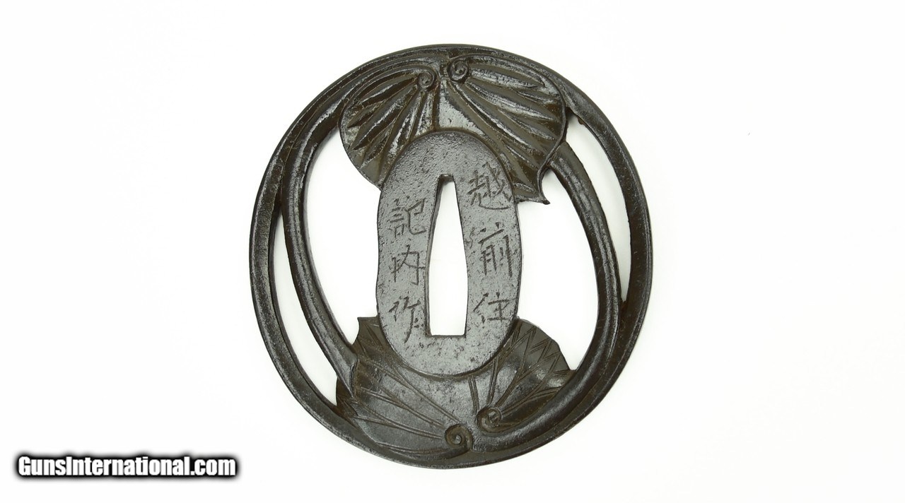 Description: "Iron Sukashi Tsuba. Diameter: 7.1cm, 2 ¾". Signed: Echizen Ju Kinai Saku. SOLD |