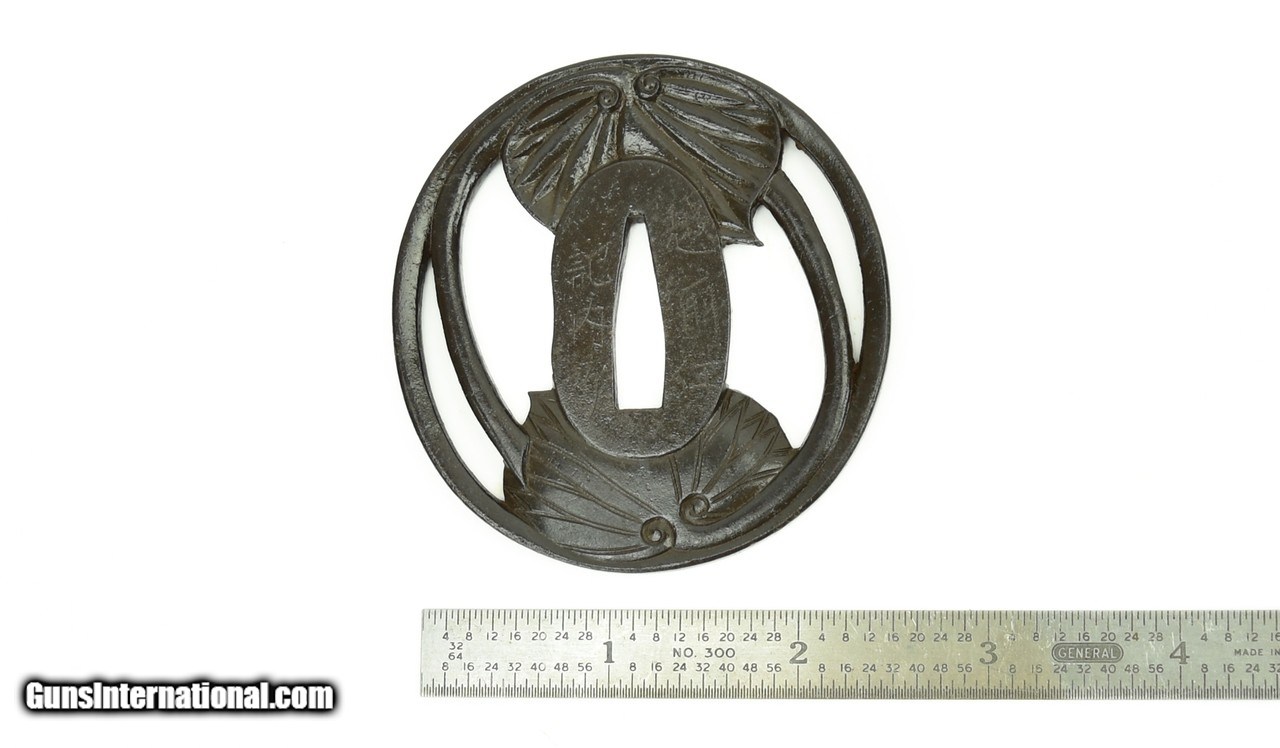 Description: "Iron Sukashi Tsuba. Diameter: 7.1cm, 2 ¾". Signed: Echizen Ju Kinai Saku. SOLD |