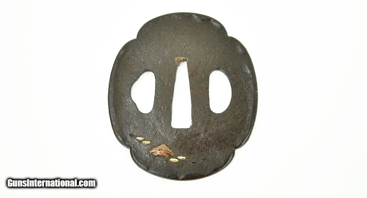Description: "Iron Tsuba. Bird flying in Rain above Foliage. For Tanto or Wakizashi. SOLD |