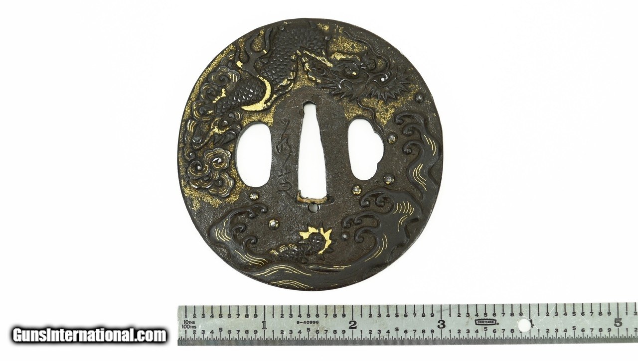Description: "Iron Tsuba. Water dragon in turbulent water with gold highlights. Reverse decorated with bamboo also with gold highlights. Signed in Sosho (grass writing): Kawamura Jakushi Hizen province. Genroku or circa 1688. Nunome Zogan pattern. SOLD |
