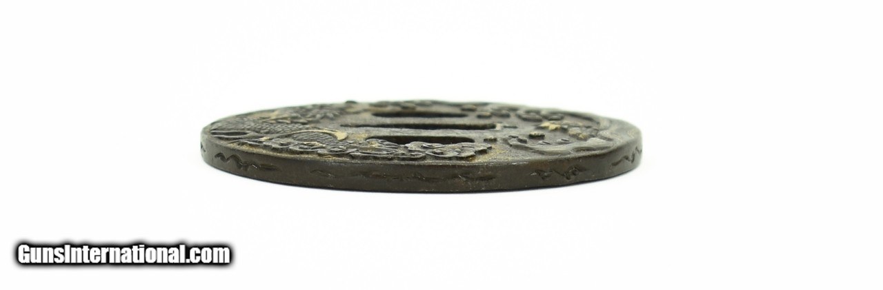 Description: "Iron Tsuba. Water dragon in turbulent water with gold highlights. Reverse decorated with bamboo also with gold highlights. Signed in Sosho (grass writing): Kawamura Jakushi Hizen province. Genroku or circa 1688. Nunome Zogan pattern. SOLD |