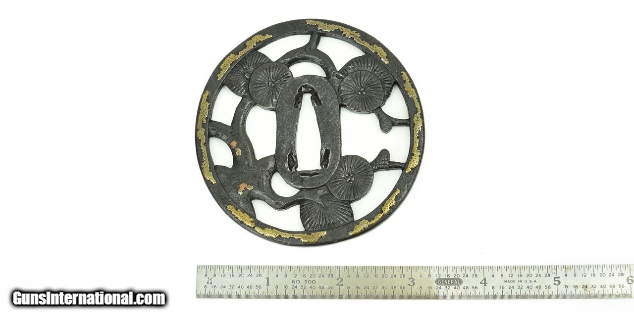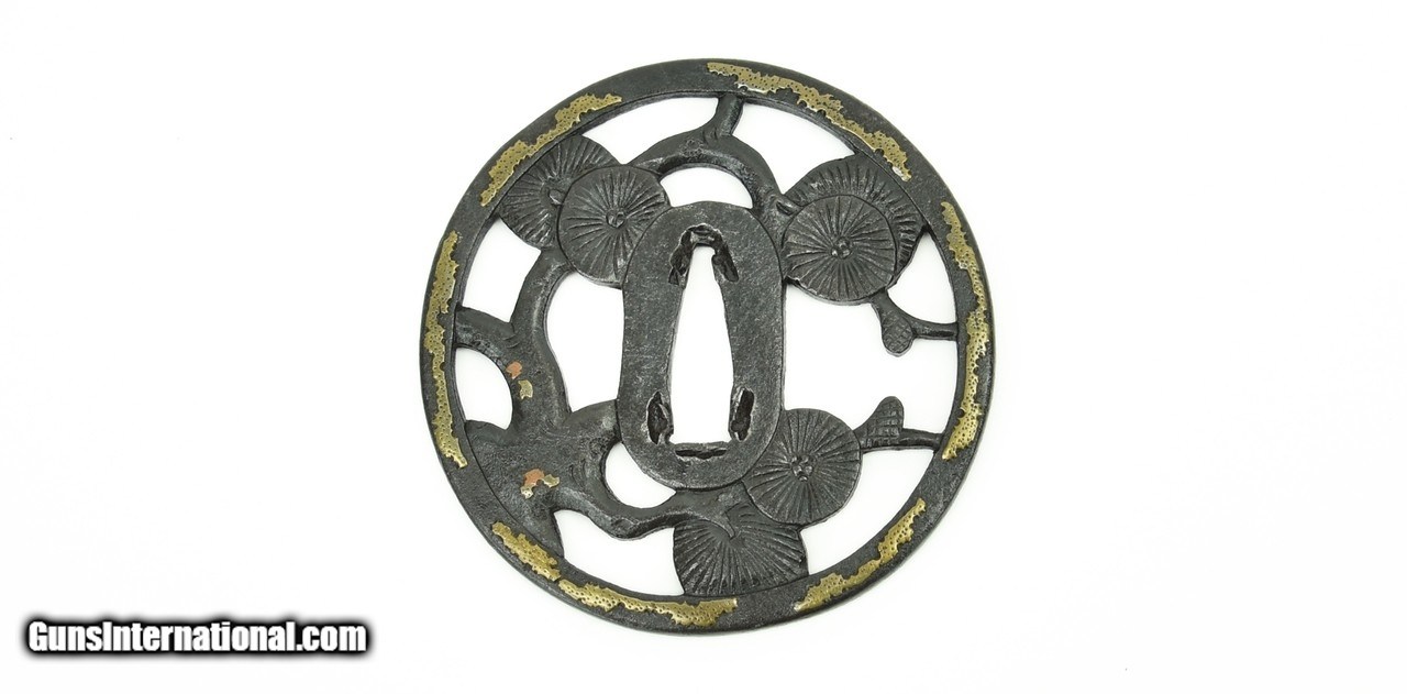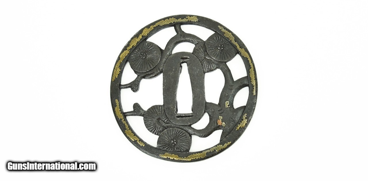 Description: "Iron Tsuba. Sukashi flowers on branches with brass flourishes on rim. Unsigned. Large size. Heianjo School (possibly). Circa 1600s. Diameter: 3 ¼", 8.5cm. SOLD |