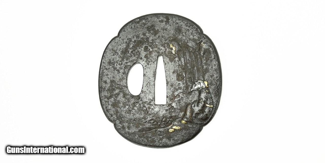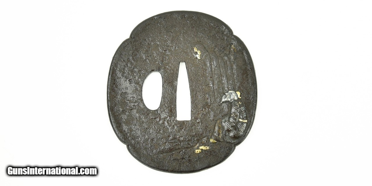 Description: "Iron Tsuba. Seated Figure with Waterfall. Gold and silver highlights. Wakizashi sized. SOLD |