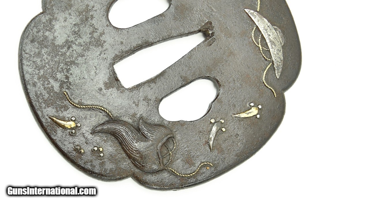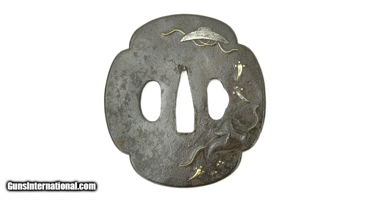 Description: "Iron Tsuba. Decorated with a silver hat with a gold cord and another device. Unsigned. Katana sized. SOLD |