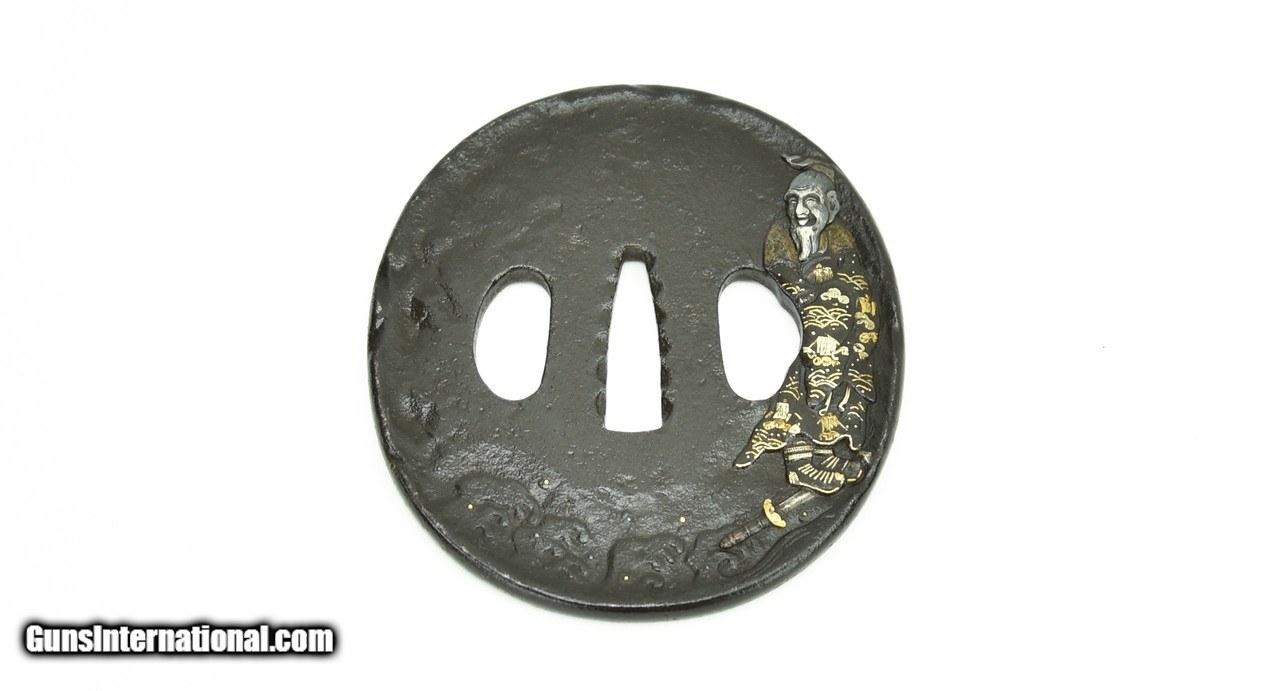 Description: "Iron Tsuba. Old figure with ornate robe standing on sword below figure. On the reverse are waves with gold and silver. SOLD |