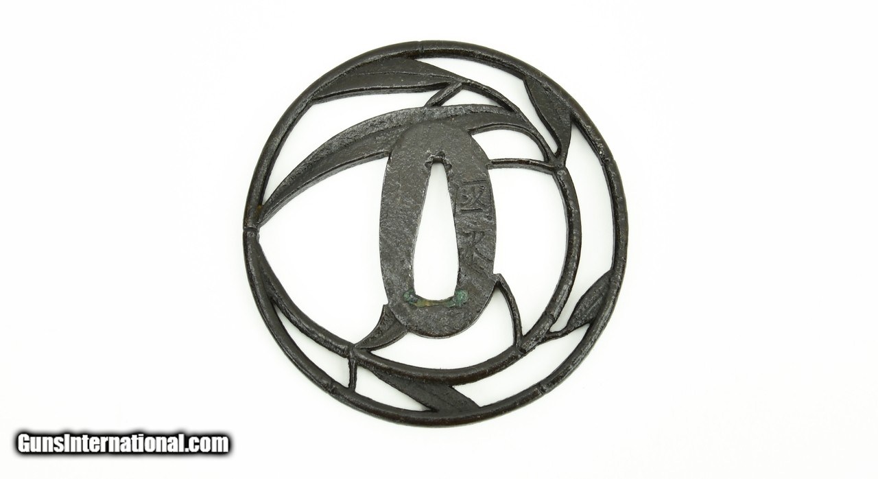 Description: "Iron Tsuba. Sukashi large leaves. Signed: Kuni Naga. SOLD |