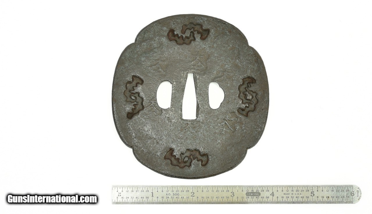 Description: "Iron Tsuba. Very large. Katana sized. Has Tenpo stamps. SOLD |