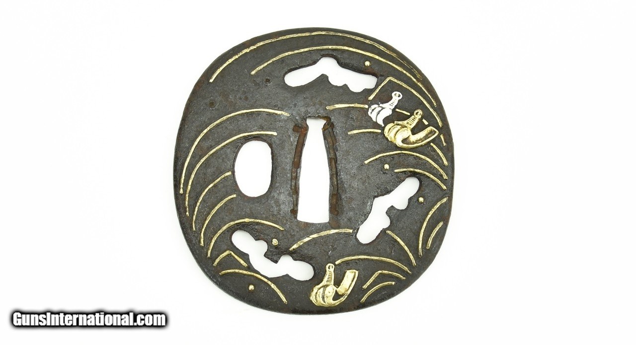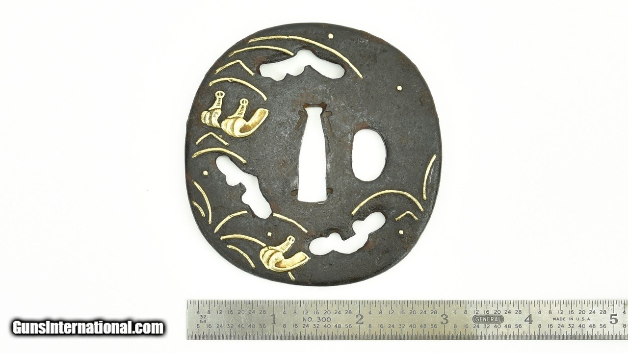 Description: "Iron Tsuba. Sukashi gold and silver. Stirrups. No signature. Katana sized. SOLD |