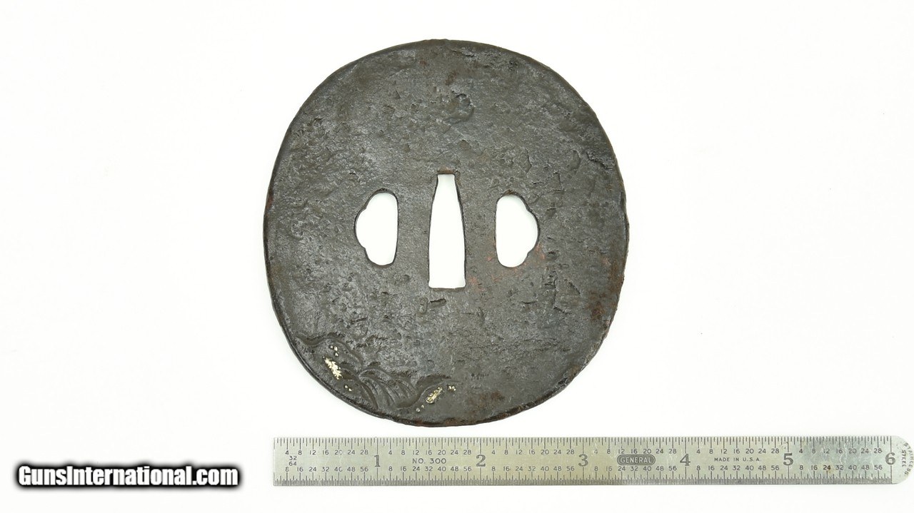 Description: "Iron Tsuba. Figure riding Ox with gold and silver patina. SOLD |