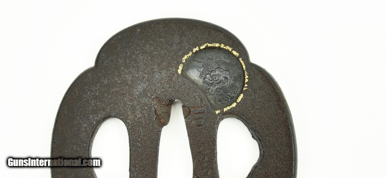 Description: "Iron Tsuba. Has Kinko insert of Shakudo Shi-Shi and 2 panels of gold foliage. Signed: first Kanji is Yoshi but following kanji is illegible. Tanto sized. SOLD |