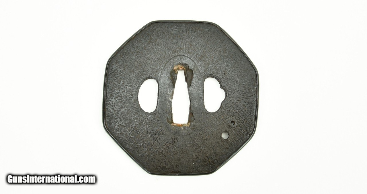 Description: "Iron Tsuba. Shakudo Rim amida Yasuri or radiantly arranged file marks. Unsigned. Nice patina. SOLD |