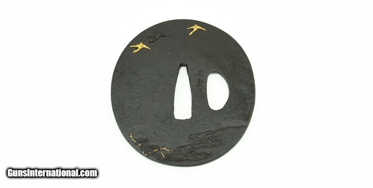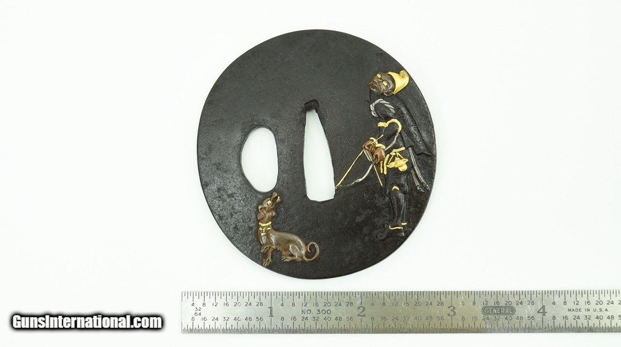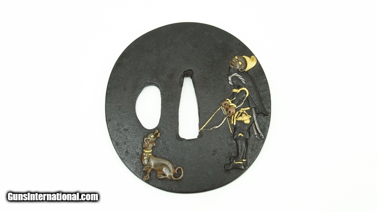 Description: "Iron Tsuba. Namban figure of a foreign hunter with bow and arrow. Dog in Sentoku on point. Both figures highlighted in gold. SOLD |