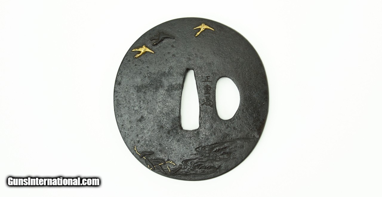Description: "Iron Tsuba. Namban figure of a foreign hunter with bow and arrow. Dog in Sentoku on point. Both figures highlighted in gold. SOLD |