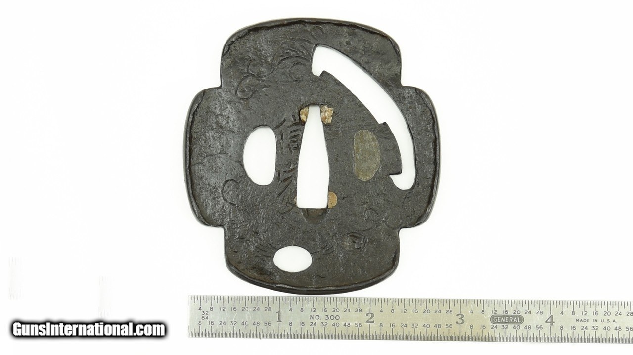 Description: "Iron Tsuba. Mokko iron plate with Tsuchime ground and hammered rim. Pierced with an ax blade. Surface decorated with flowering vines, with wood box inscribed with an attestation by Sato Kanzan. This Nobuie worked in Kaga. SOLD |