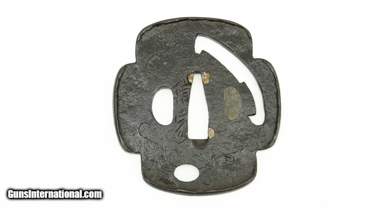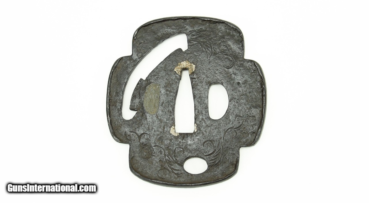 Description: "Iron Tsuba. Mokko iron plate with Tsuchime ground and hammered rim. Pierced with an ax blade. Surface decorated with flowering vines, with wood box inscribed with an attestation by Sato Kanzan. This Nobuie worked in Kaga. SOLD |